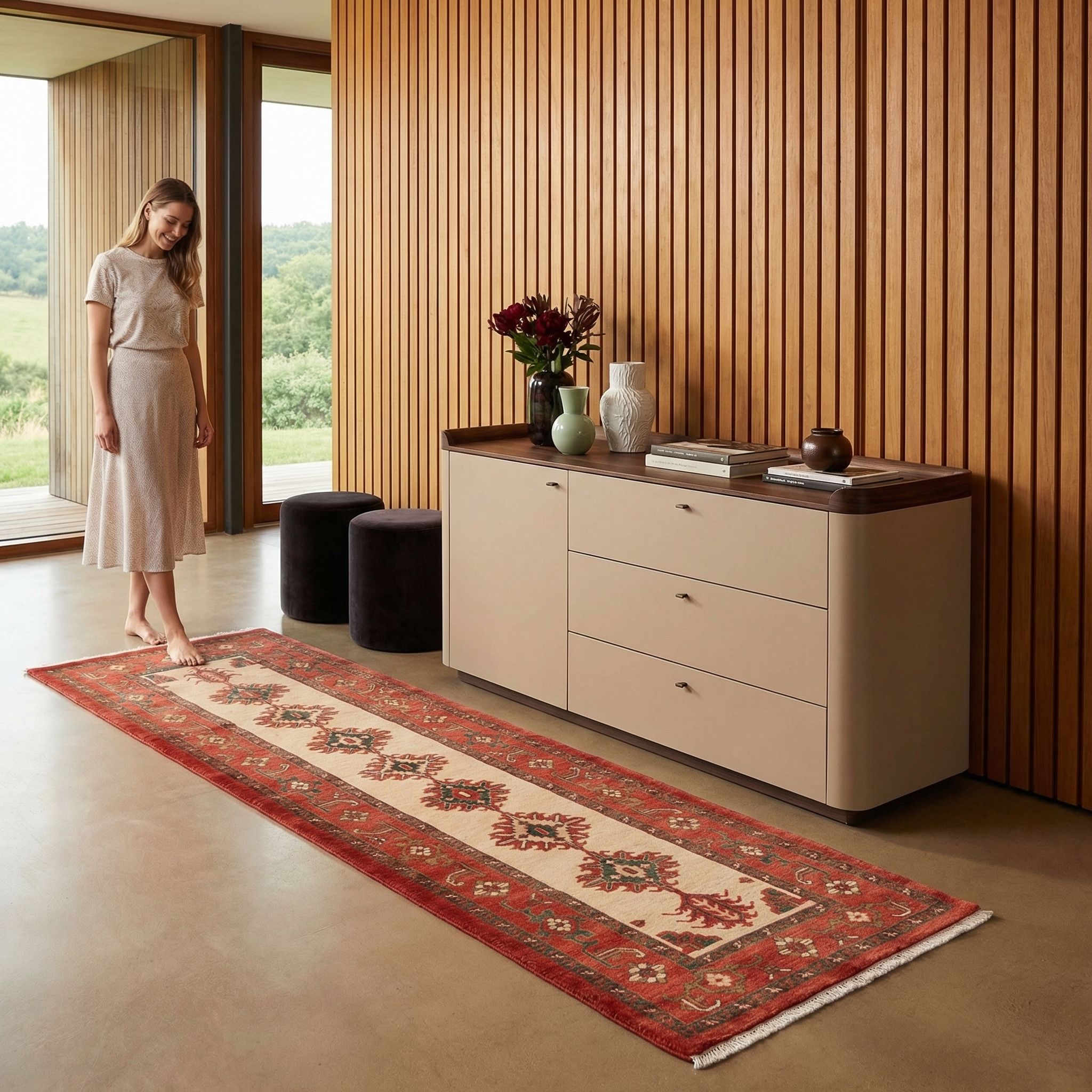 Als gekonnter Stilbruch entfaltet dieser Teppich im Industrial-Style eine faszinierende Wirkung, indem er kühlen Materialien wie Beton, Stahl und unverputztem Mauerwerk pure Wärme entgegensetzt. Der Kontrast zwischen der rauen, urbanen Loft-Architektur und der feinen, meisterhaften Handwerkskunst aus dem Hause Mesgarzadeh erzeugt eine Spannung, die den Raum sofort wohnlich und edel wirken lässt. Die kräftigen Rottöne und das geometrische Design des Läufers behaupten sich visuell stark gegen dunkle Ledermöbel und Metallregale, ohne dabei antiquiert zu wirken. So wird der Ghadimi zum luxuriösen Ankerpunkt, der dem maskulinen Industrie-Look Seele und geschichtliche Tiefe verleiht.