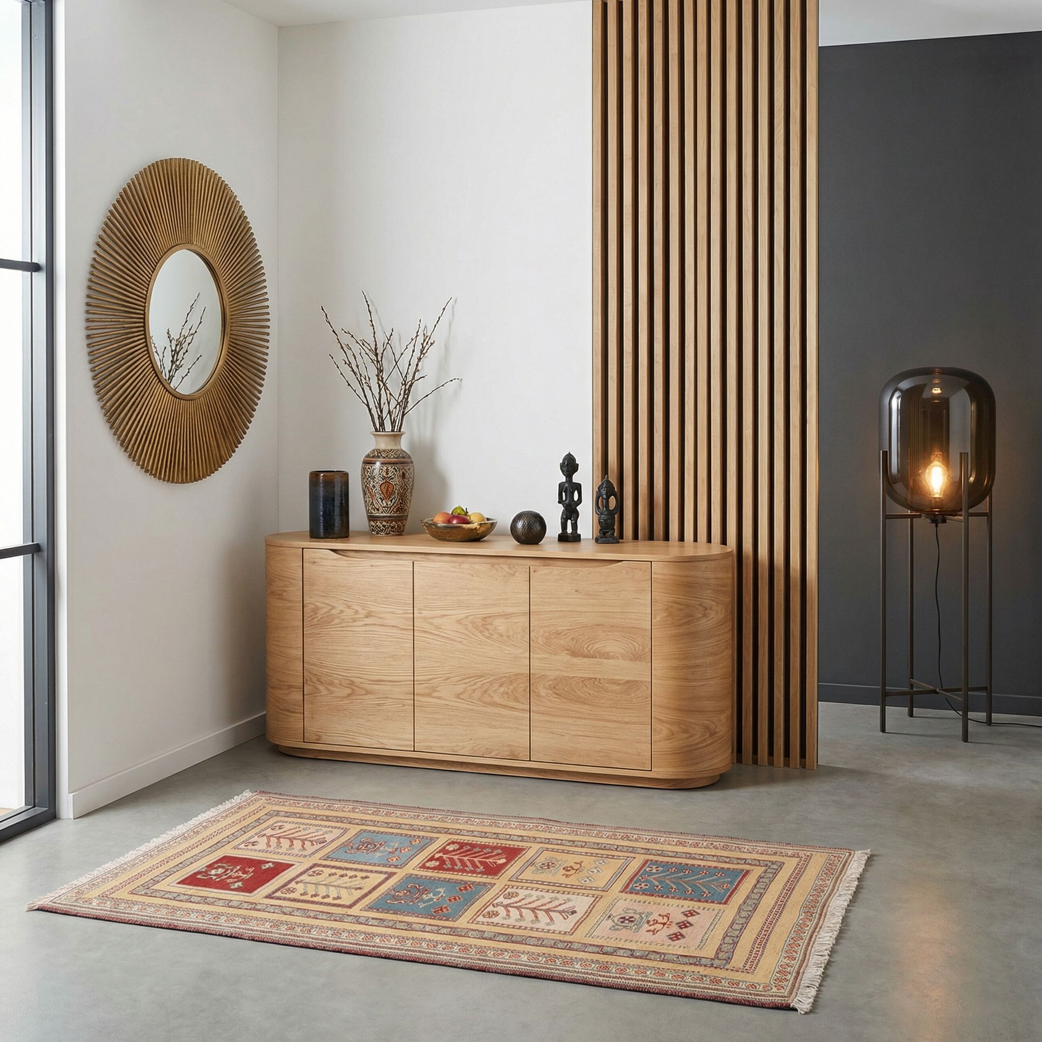In einem modernen, reduzierten Ambiente fungiert dieser feine Sumack-Kelim als exklusiver „Stilbruch“, der dem Raum sofortige Wärme und Seele verleiht. Die klare, geometrische Rasteraufteilung des Designs korrespondiert hervorragend mit der geradlinigen Formensprache zeitgenössischer Möbel, während die traditionelle Handarbeit einen spannenden Kontrast zu glatten Oberflächen bildet. Die hochwertigen Naturmaterialien und die feine Knüpfung unterstreichen den Anspruch an Luxus und Qualität im Contemporary-Design. So wird der Teppich zum kuratierten Kunstobjekt am Boden, das moderne Kühle stilvoll aufbricht und visuelle Tiefe schafft.