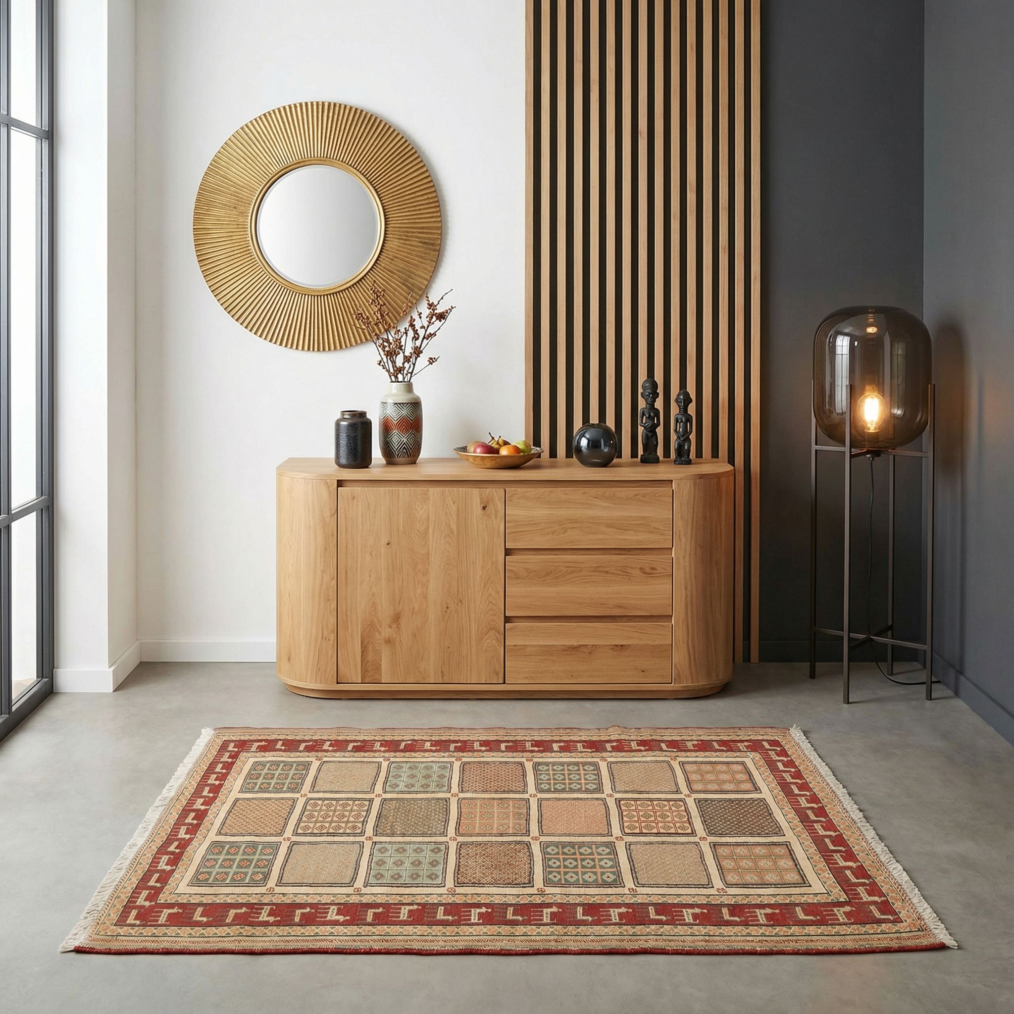 Der Afschar-Tabii Sumack-Kelim beeindruckt durch seine harmonische Farbkombination und kunstvolle Musterung. Die Hauptfarbe dieses Teppichs ist ein warmes Beige, das die Basis für die vielfältigen Muster bildet. Ergänzt wird es durch ein kräftiges Rot, das die äußeren Ränder und einige der zentralen Motive ziert. Ein tiefes Blau verleiht dem Teppich Tiefe und Kontrast, während ein sanftes Grün die Farbpalette abrundet. Die Musterung ist geprägt von geometrischen Formen und ...mehr Beschreibung