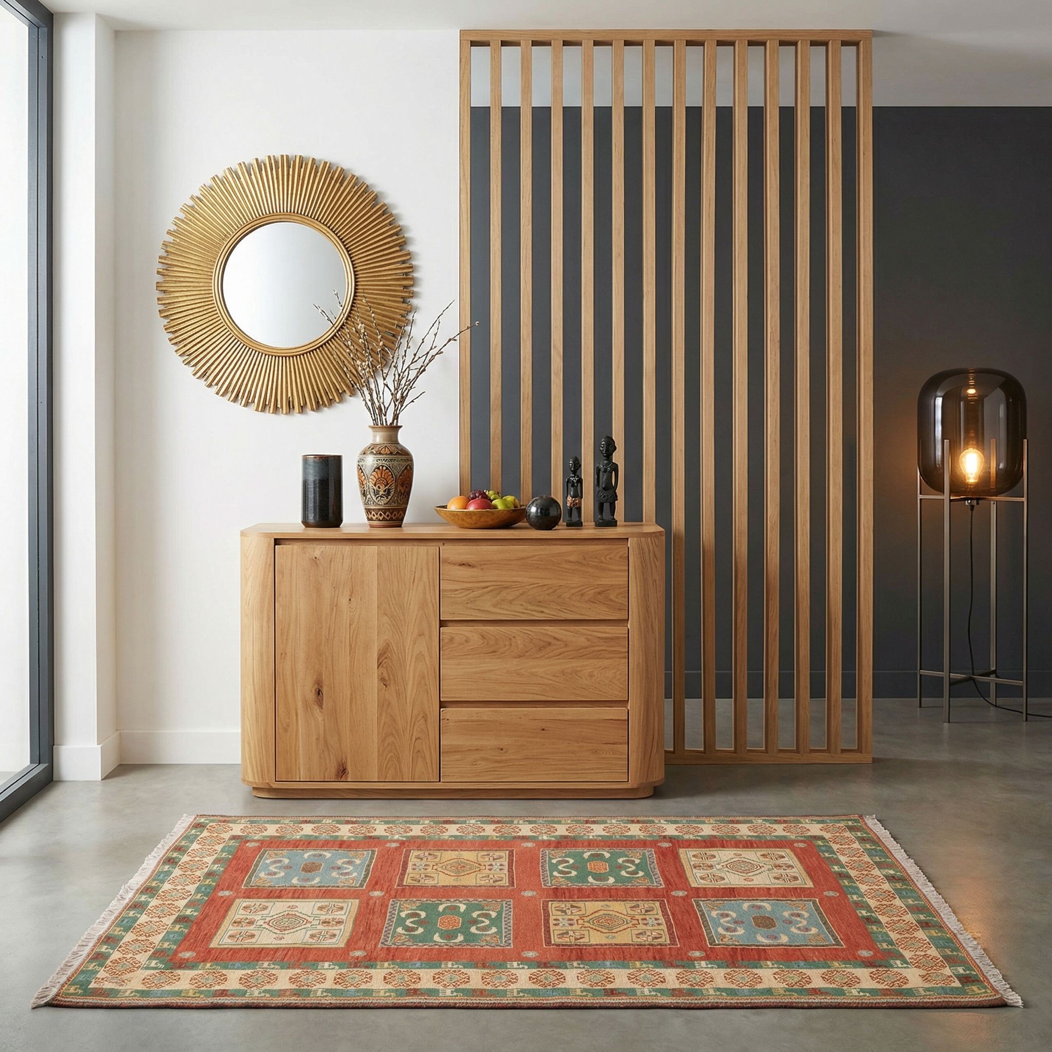 Der Afschar-Tabii Sumack-Kelim präsentiert sich in einem dominanten Terrakotta-Rotton, der dem Teppich eine warme und einladende Ausstrahlung verleiht. Akzente in Creme und ein kräftiges Grün ergänzen das Farbspektrum, wobei ein sanftes Blau die Farbpalette harmonisch abrundet. Diese Kombination aus Naturfarben verleiht dem Teppich seine zeitlose Eleganz und macht ihn zu einem echten Blickfang.Die Musterung des Teppichs ist durch geometrische Formen und traditionelle Nomadenmotive ...