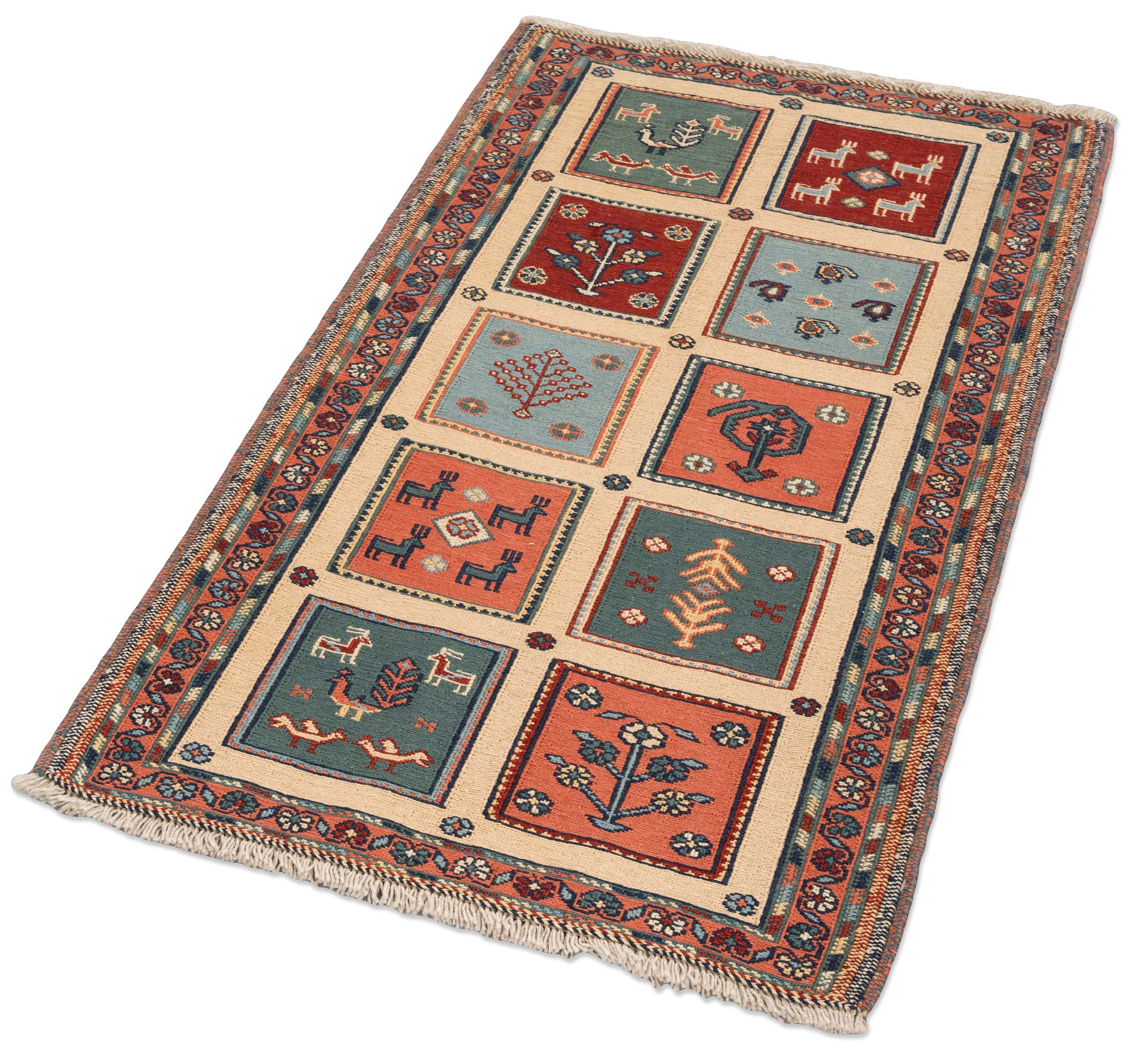 Diese kunstvollen und besonders zeitaufwendigen Webarbeiten gehören ebenfalls zur Familie der Kelims. Sumack-Arbeiten werden von Jahr zu Jahr seltener und heute eigentlich kaum noch neu angefertigt. Diese Lücke füllt unsere Eigenproduktion, der „Afschar-Tabii“.