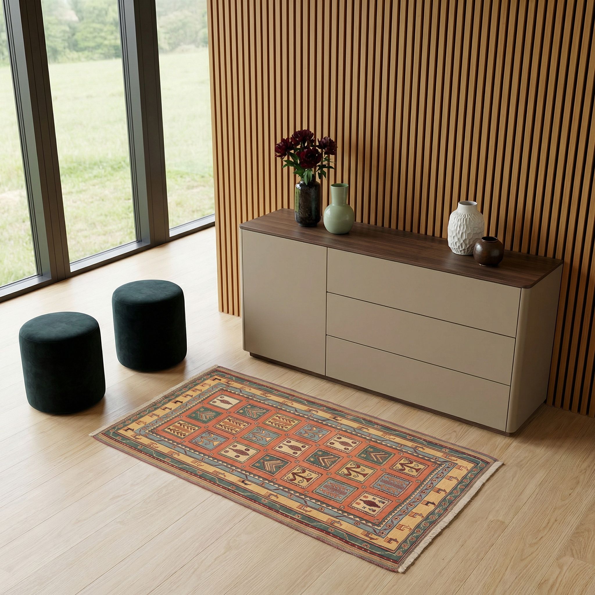 In einem modernen, reduzierten Ambiente fungiert dieser feine Sumack-Kelim als exklusiver Stilbruch, der dem Raum sofort Charakter und Tiefe verleiht. Die klare geometrische Kachel-Aufteilung des Musters korrespondiert hervorragend mit den geraden Linien zeitgenössischer Designermöbel, während die Naturfarben die Strenge sanft brechen. Als handwerkliches Meisterstück aus dem Hause Mesgarzadeh setzt er einen bewussten Kontrapunkt zu glatten Oberflächen wie Glas oder Chrom. So verbindet dieser Teppich höchste Qualität mit modernem Wohnen und schafft eine luxuriöse Balance zwischen Tradition und Gegenwart.