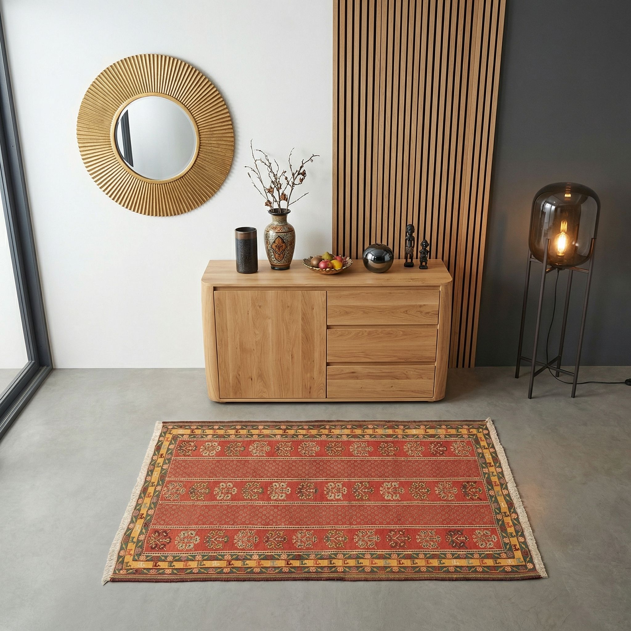 Hier präsentieren wir den Afschar-Tabii, einen prächtigen Sumack-Kelim aus Persien. Dieser Teppich besticht durch seine warme, erdige Hauptfarbe in einem tiefen Rotton, der ein Gefühl von Behaglichkeit und Eleganz vermittelt. Die kunstvollen Muster sind in harmonischen Farben gehalten, darunter ein sanftes Creme, ein lebhaftes Grün und ein warmes Gelb, die dem Teppich eine lebendige und zugleich edle Ausstrahlung verleihen.Die floralen und geometrischen Muster sind sorgfältig und ...