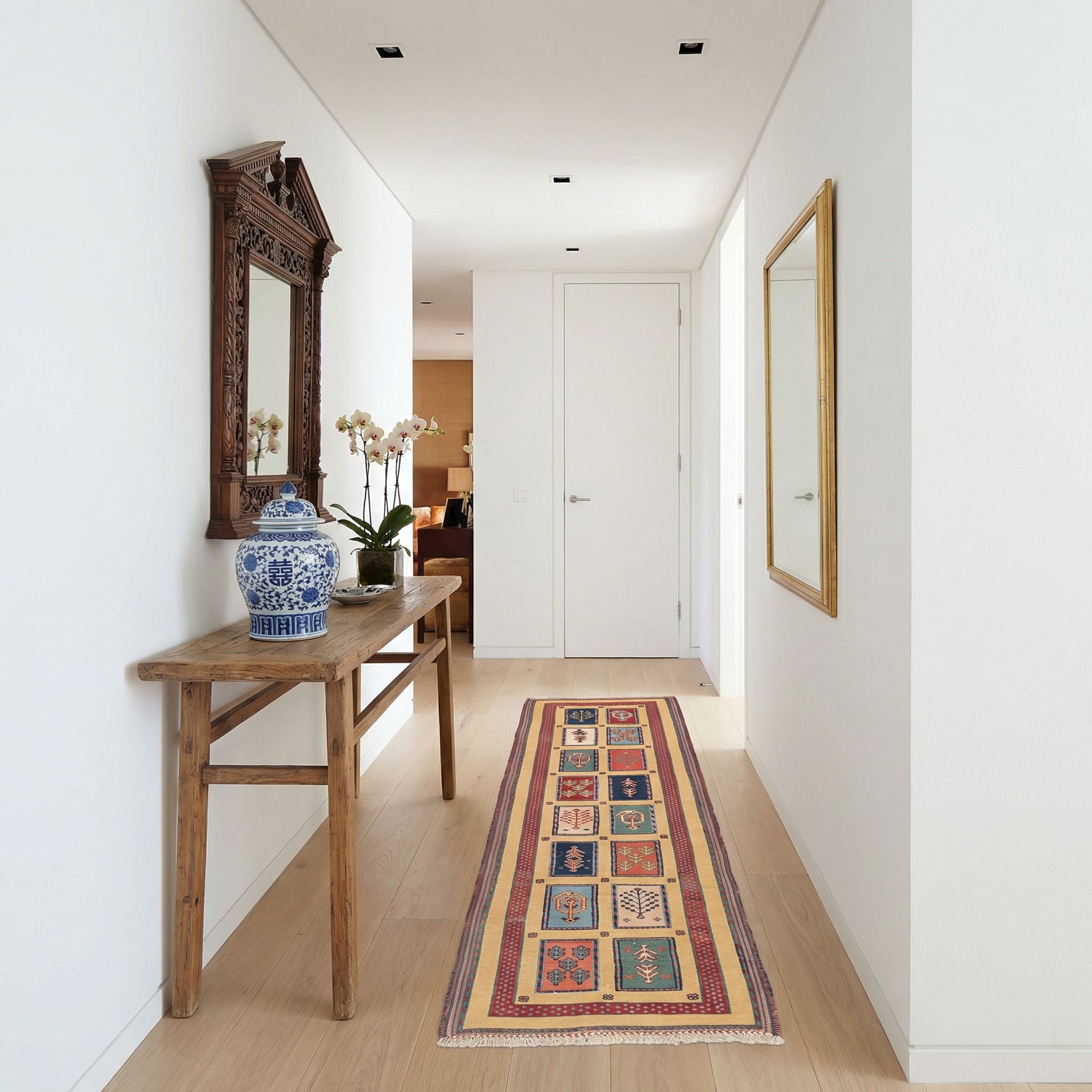 Die natürliche Anmutung der handversponnenen Schafwolle macht diesen Kelim zur idealen Ergänzung für den frischen, gemütlichen New-Country-Look. Seine warmen Gelb- und Rottöne bilden einen einladenden Kontrast zu hellen Leinenstoffen, weiß lasierten Möbeln und naturbelassenen Holzböden. Da Sumack-Kelims besonders flach und dennoch widerstandsfähiger als gewöhnliche Webteppiche sind, eignen sie sich hervorragend für belebte Landhaus-Wohnbereiche, in denen Ästhetik auf Alltagstauglichkeit trifft. Mit diesem Stück zieht ländliche Geborgenheit in höchster handwerklicher Qualität bei Ihnen ein.