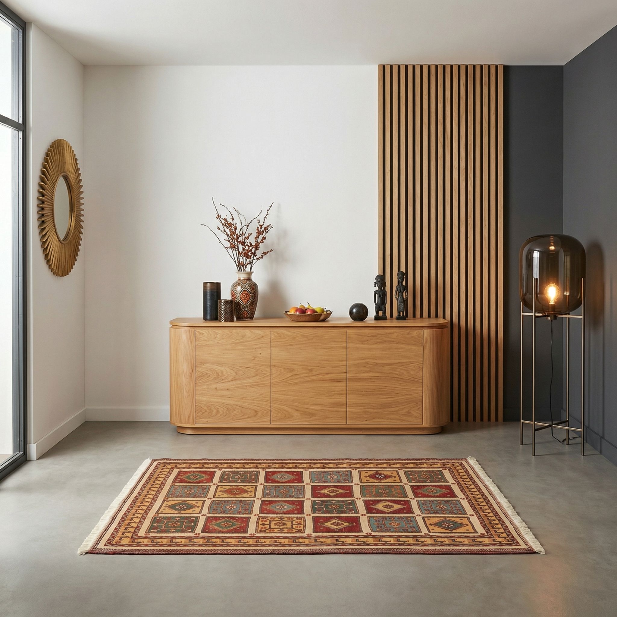 Afschar-Tabii: Nach dem Erfolg der Ghadimi, Bidjar-Novum, Afschar-Kamo und Gaschgai-Spirit Projekte präsentieren wir stolz den Afschar-Tabii - ein weiteres beeindruckendes Meisterwerk von Mesgarzadeh in Persien. Dieser außergewöhnlich strapazierfähige Sumack-Kelim vereint die Wiederbelebung alter Nomadenkunst mit einer herausragenden Qualität und den besten Materialien.Der Afschar-Tabii wird in einem kleinen süd-ostpersischen Dorf hergestellt und verkörpert die traditionelle persische ...