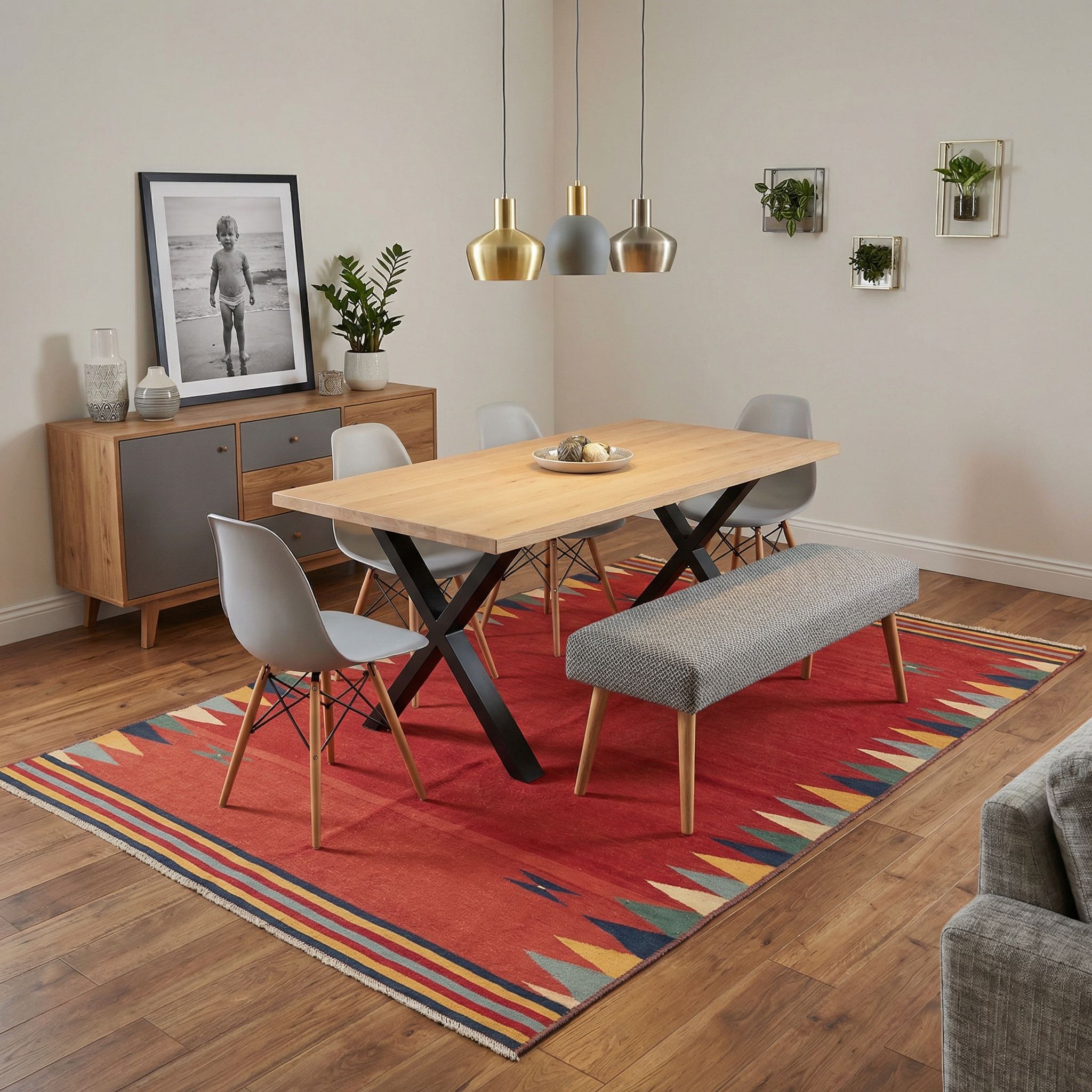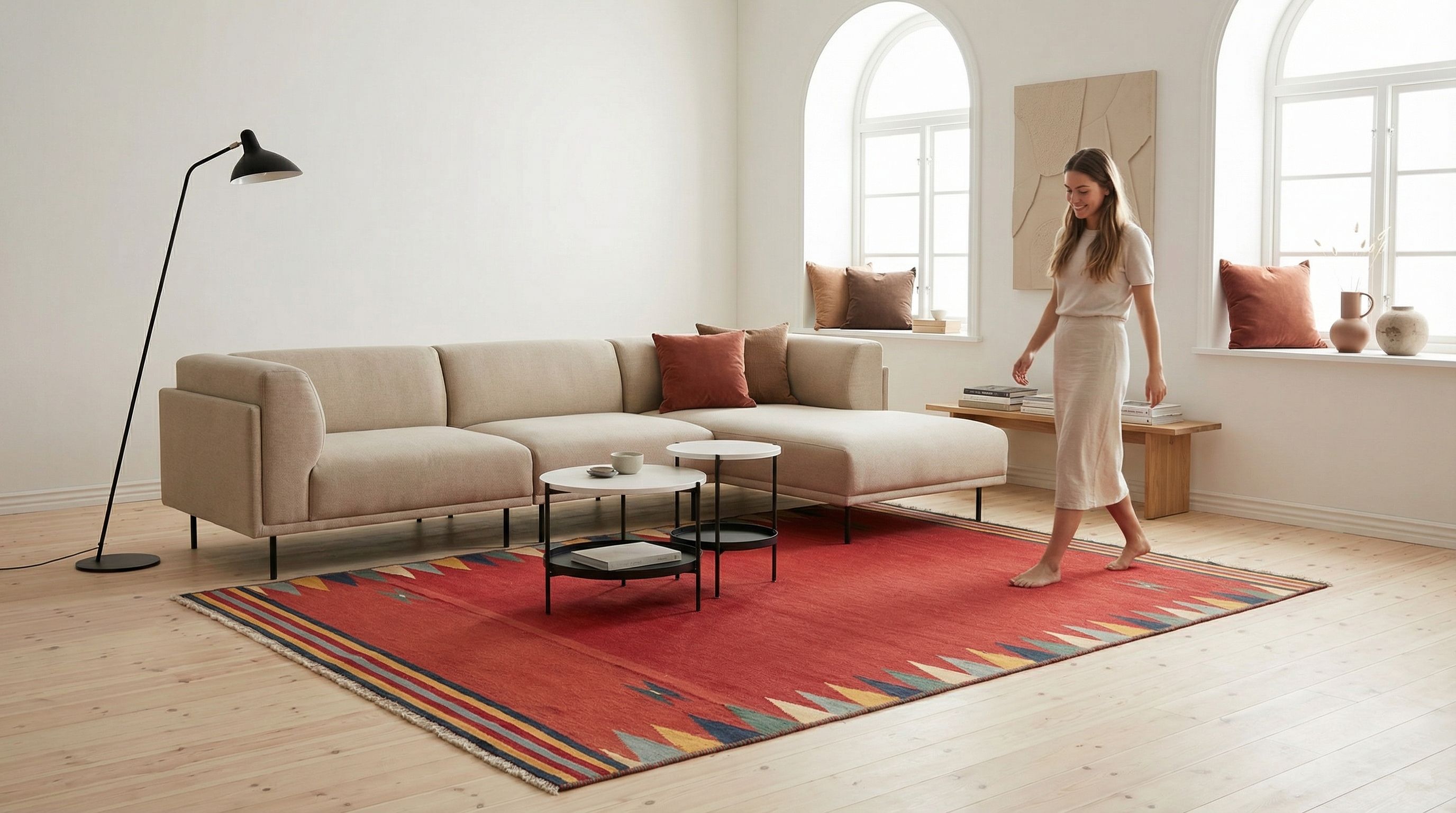 Auch im nordischen Scandinavian-Style kann dieser Kelim als bewusster farblicher Akzent Wunder wirken und das berühmte „Hygge“-Gefühl verstärken. Während die Einrichtung oft in Weiß, Grau und hellem Holz gehalten ist, bringt das warme Rot des Teppichs Leben in den Raum, wobei die geometrischen Dreiecke die klare nordische Formensprache aufgreifen. Die Verwendung reinster Naturmaterialien entspricht exakt der skandinavischen Philosophie von Nachhaltigkeit und einer tiefen Verbundenheit zur Natur. Er durchbricht die monochrome Palette auf geschmackvolle Weise und sorgt für eine warme, einladende Note, die den Raum sofort gemütlicher macht.