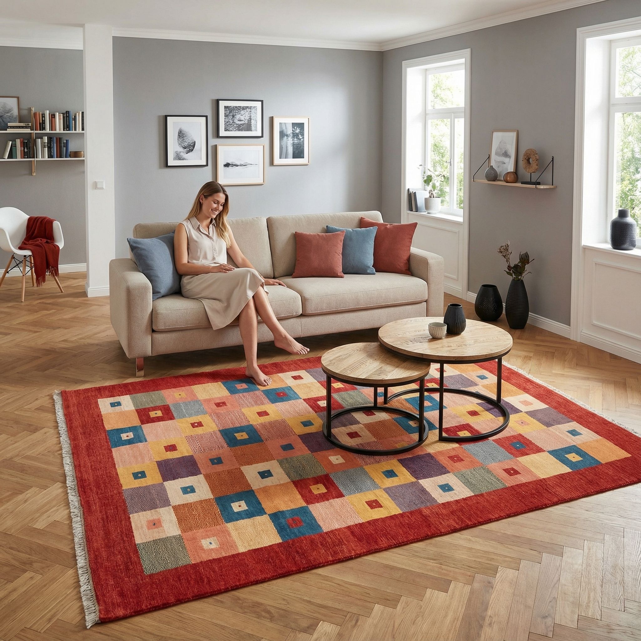 Obwohl das skandinavische Design für Zurückhaltung bekannt ist, dient dieser hochwertige Wollteppich als gemütliches „Hygge“-Highlight, das notwendige Wärme in helle, cleane Räume bringt. Die geometrische Klarheit des Musters verträgt sich exzellent mit der geradlinigen Formensprache nordischer Möbel, während die Naturfarben einen fröhlichen, einladenden Akzent setzen. Die Verwendung feinster handversponnener Schafwolle unterstreicht die skandinavische Liebe zu ehrlichen Naturmaterialien und nachhaltiger Qualität. So bewahrt der Teppich einen weißen Raum davor, steril zu wirken, und fügt eine Note von Individualität und Geborgenheit hinzu.