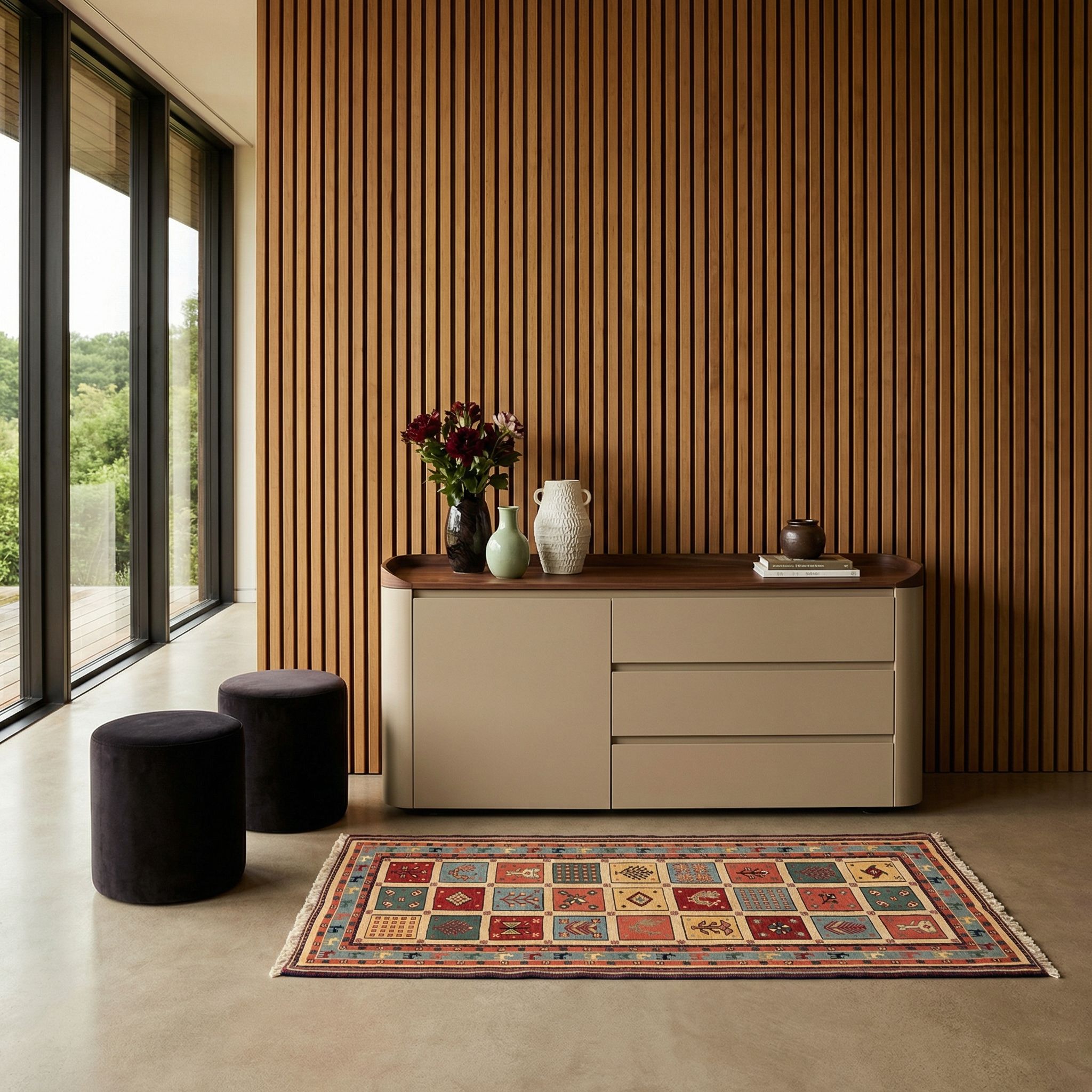 In einem modernen, reduzierten Ambiente fungiert dieser feine Sumack-Kelim als exklusives Kunstwerk am Boden, das Wärme und Charakter in kühle Räume bringt. Die klare, kachelartige Aufteilung des Musters korrespondiert hervorragend mit der geradlinigen Architektur des Contemporary-Style, während die natürlichen Farbnuancen die Strenge sanft brechen. Dieser bewusste Stilbruch zwischen hochmoderner Einrichtung und jahrhundertealter Knüpfkunst zeugt von sicherem Geschmack und einem Gespür für wahre Qualität. Dank der festen Struktur und der rutschfesten Unterlage liegt das Unikat auch auf glattem Parkett oder Sichtbeton perfekt und sicher.
