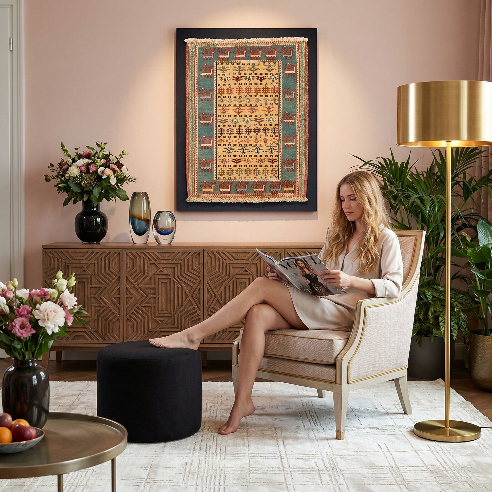 Bringen Sie Farbe und Wärme in die kühle Eleganz des skandinavischen Designs, indem Sie diesen Sumack-Kelim als gezielten Stilbruch und gemütlichen „Hygge“-Akzent einsetzen. Die hochwertige, handversponnene Schafwolle sorgt für eine haptisch angenehme Oberfläche, die die nordische Liebe zu natürlichen Materialien und funktionaler Ästhetik perfekt widerspiegelt. Die klaren, grafischen Muster des Afschar-Tabii fügen sich nahtlos in die skandinavische Formsprache ein, während die sanften Naturfarben den Raum beleben, ohne ihn zu dominieren. Dieser langlebige Design-Klassiker beweist, dass sich nordische Zurückhaltung und orientalische Handwerkskunst zu einem harmonischen und stilvollen Ganzen verbinden lassen.