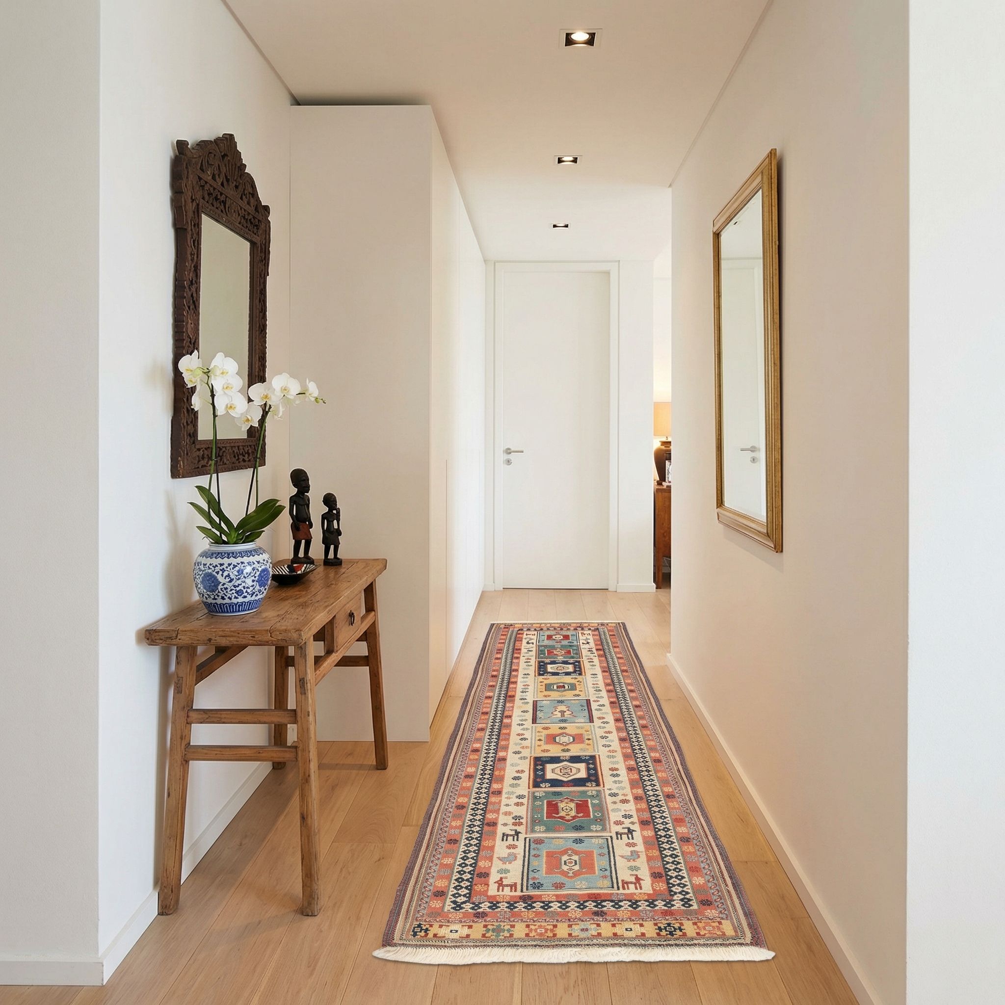 In einem cleanen, modernen Ambiente fungiert dieser feine Sumack-Kelim als spannender Stilbruch, der dem Raum Wärme und Tiefe verleiht, ohne überladen zu wirken. Die geometrische Klarheit der Medaillons korrespondiert überraschend gut mit geradlinigem Mobiliar, während die hochwertigsten Naturmaterialien einen luxuriösen Kontrast zu glatten Oberflächen wie Glas oder Beton bilden. Als handgefertigtes Unikat erdet er den kurzlebigen Zeitgeist mit zeitloser Qualität und wird zum exklusiven Blickfang auf dem Boden. Er beweist, dass wahre Designqualität keine zeitlichen Grenzen kennt und verbindet Tradition mit der Moderne.