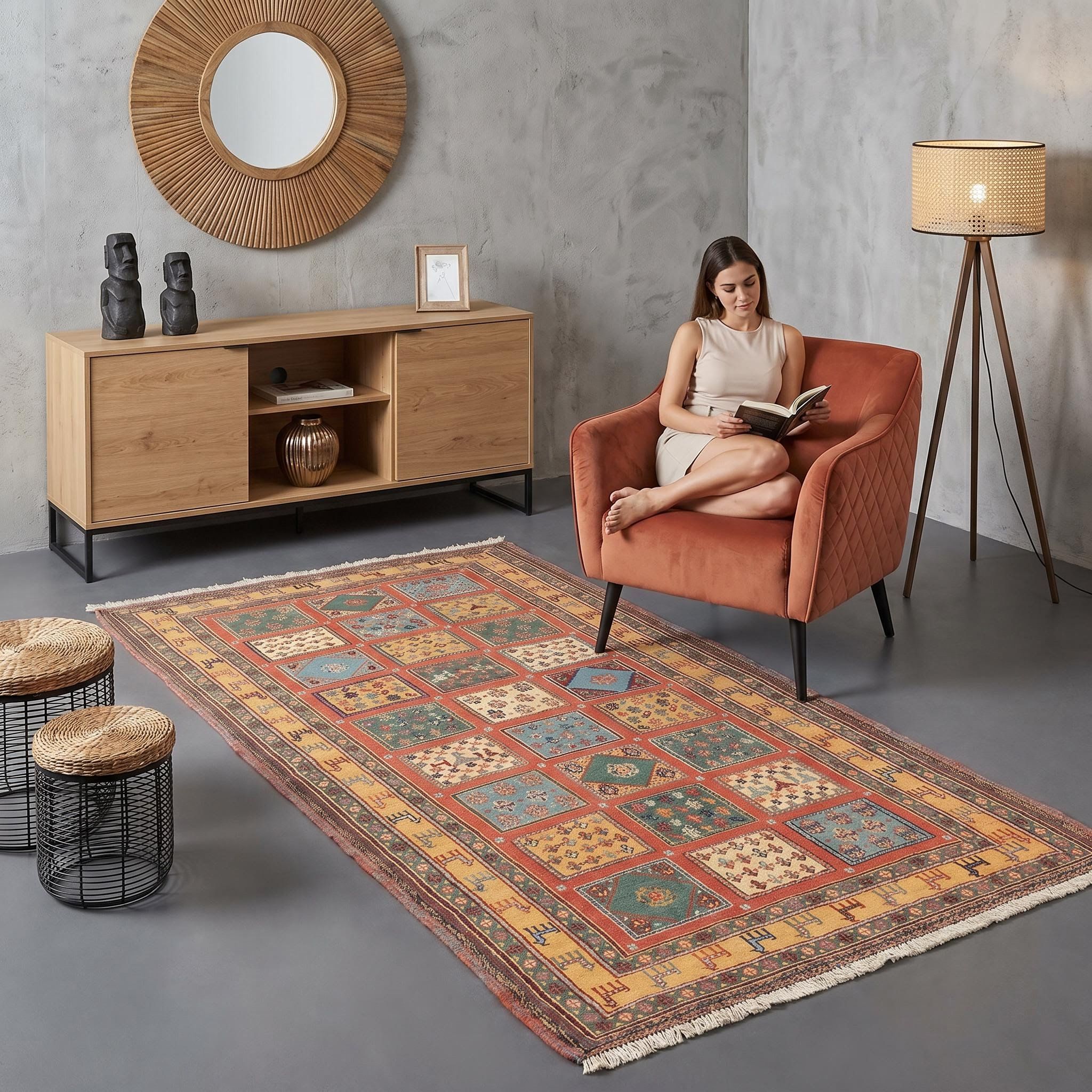 In einem rauen Loft-Ambiente aus Beton, Stahl und unverputztem Mauerwerk wirkt dieser edle Sumack-Kelim als spektakulärer, wärmender Gegenpol. Die kräftigen Farben und die filigrane Handwerkskunst bilden einen spannenden Kontrast zur kühlen, unfertigen Ästhetik des Industrial-Styles und brechen dessen Härte gekonnt auf. Dank seiner außergewöhnlichen Robustheit und festen Struktur behauptet sich der Teppich mühelos auf groben Untergründen und verleiht dem Raum wohnliche Tiefe. Dieses handgeknüpfte Unikat macht aus einer kühlen Fabriketage ein stilvolles Zuhause mit Geschichte und persönlicher Note.