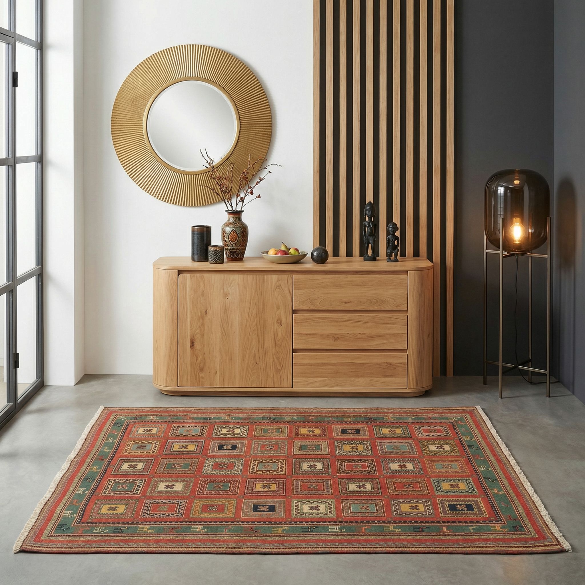 In einem cleanen Contemporary-Ambiente sorgt dieser feine Sumack-Kelim für einen spannenden Kontrast, der dem Raum Leben und Charakter einhaucht. Das klare, geometrische Rastermuster des Teppichs korrespondiert überraschend gut mit der Geradlinigkeit moderner Möbel, während die warmen Terrakotta-Töne die Strenge des Designs aufbrechen. Dieser hochwertige Stilbruch verhindert, dass ein kühler, moderner Raum steril wirkt, und fügt eine Ebene von sophistizierter Gemütlichkeit hinzu. Die exzellente Verarbeitung und die flache, widerstandsfähige Struktur unterstreichen dabei den Anspruch an Qualität und Nachhaltigkeit in modernen Wohnkonzepten.