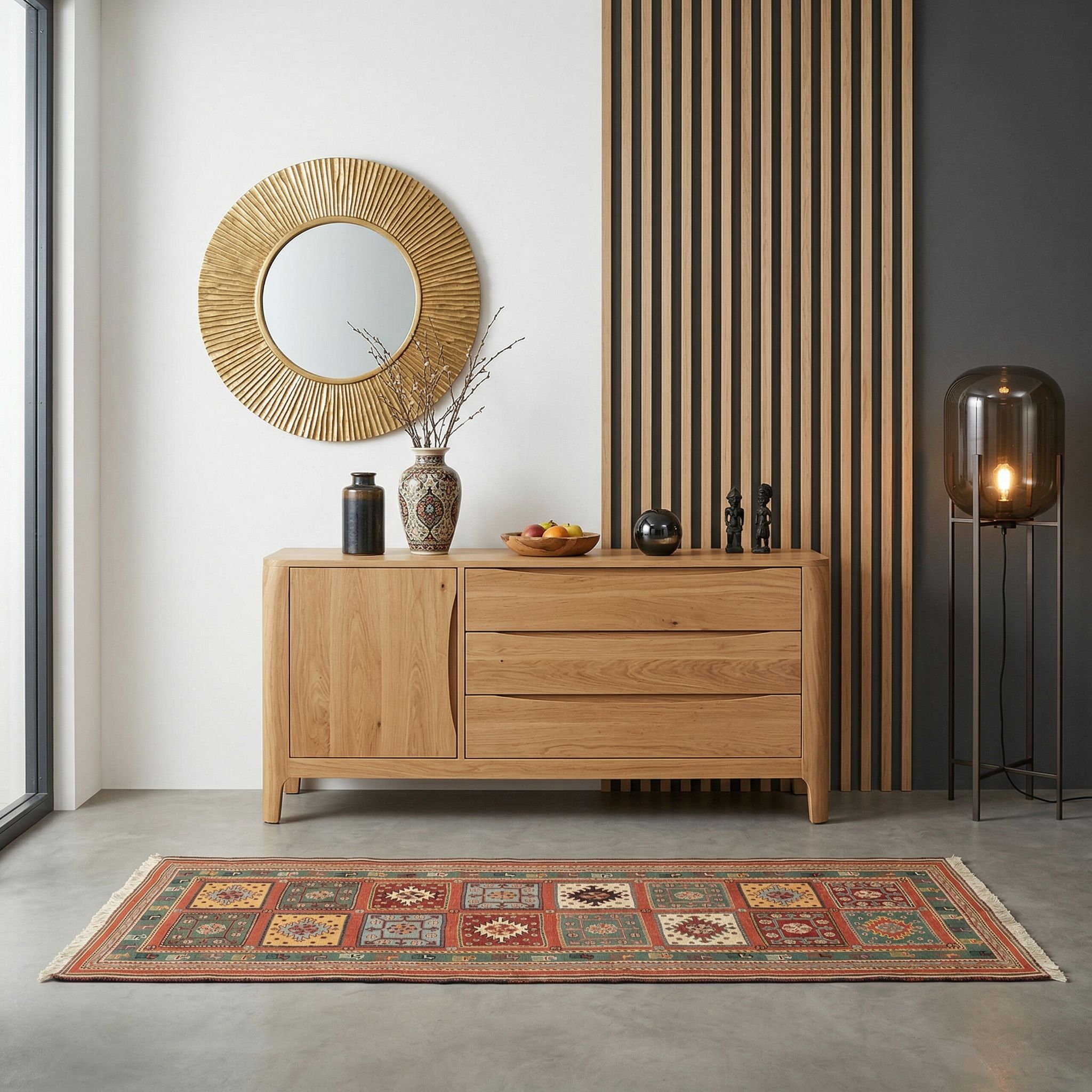 In einem cleanen, modernen Ambiente fungiert dieser feine Sumack-Kelim als spannender Stilbruch, der dem Raum Wärme und Charakter einhaucht. Das geometrische Kacheldesign korrespondiert überraschend gut mit geradlinigem Mobiliar, während die nuancierten Naturfarben die visuelle Strenge minimalistischer Interieurs gekonnt aufbrechen. Die hochwertige Haptik der handversponnenen Wolle bietet einen edlen Kontrast zu glatten Oberflächen wie Glas, Chrom oder Beton und sorgt für eine sophistizierte Balance. So verwandelt der Afschar-Tabii einen kühlen Design-Raum in einen einladenden Wohnbereich mit individueller, künstlerischer Note.
