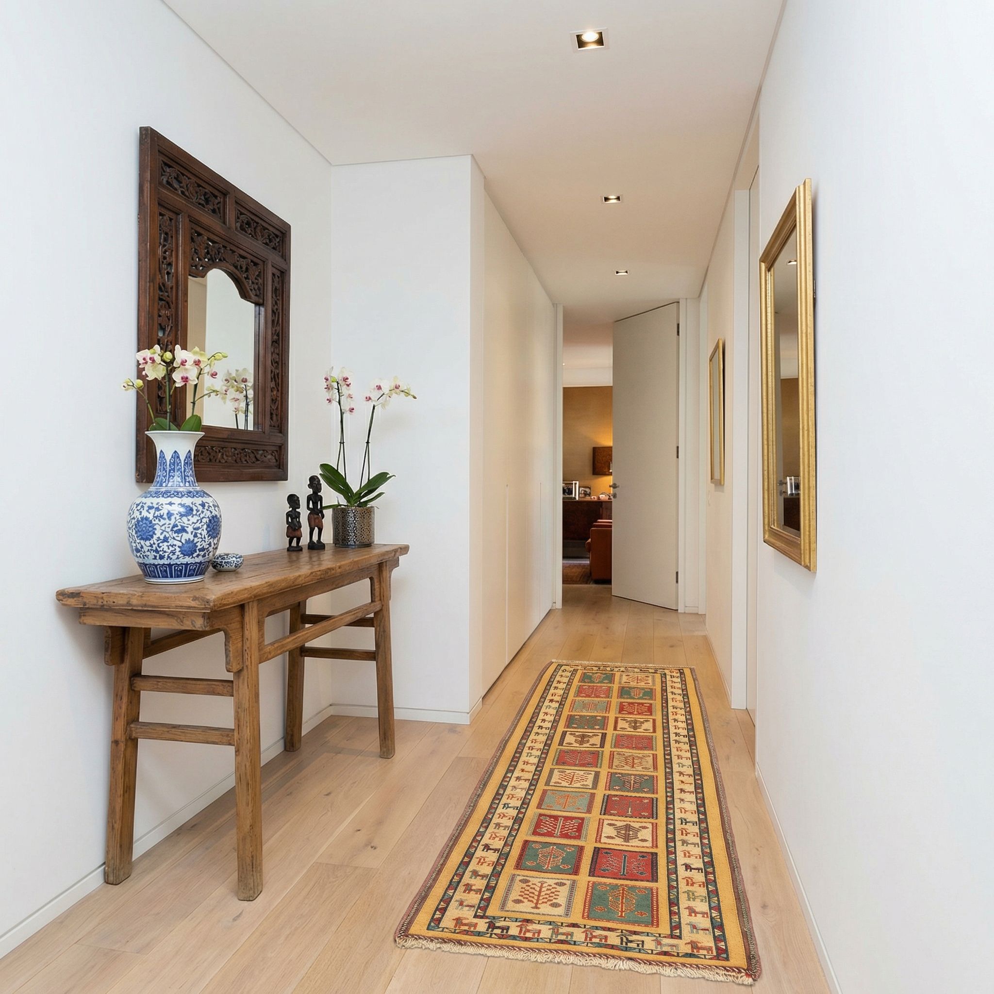 Als warmer Kontrast zur kühlen Eleganz des skandinavischen Stils bringt dieser farbenfrohe Läufer die nötige Portion "Hygge" und Wohnlichkeit in Ihr Zuhause. Die klare, geometrische Bildsprache der Baummotive korrespondiert überraschend gut mit der geradlinigen nordischen Formensprache, während das sonnige Gelb einen strahlenden Akzent setzt. Die Verwendung von Naturmaterialien wie handversponnener Schafwolle unterstreicht die skandinavische Wertschätzung für Nachhaltigkeit und hohe Handwerkskunst. Mit diesem robusten Sumack-Kelim brechen Sie die monochrome Palette stilvoll auf und verleihen dem Raum eine einladende, persönliche Seele.
