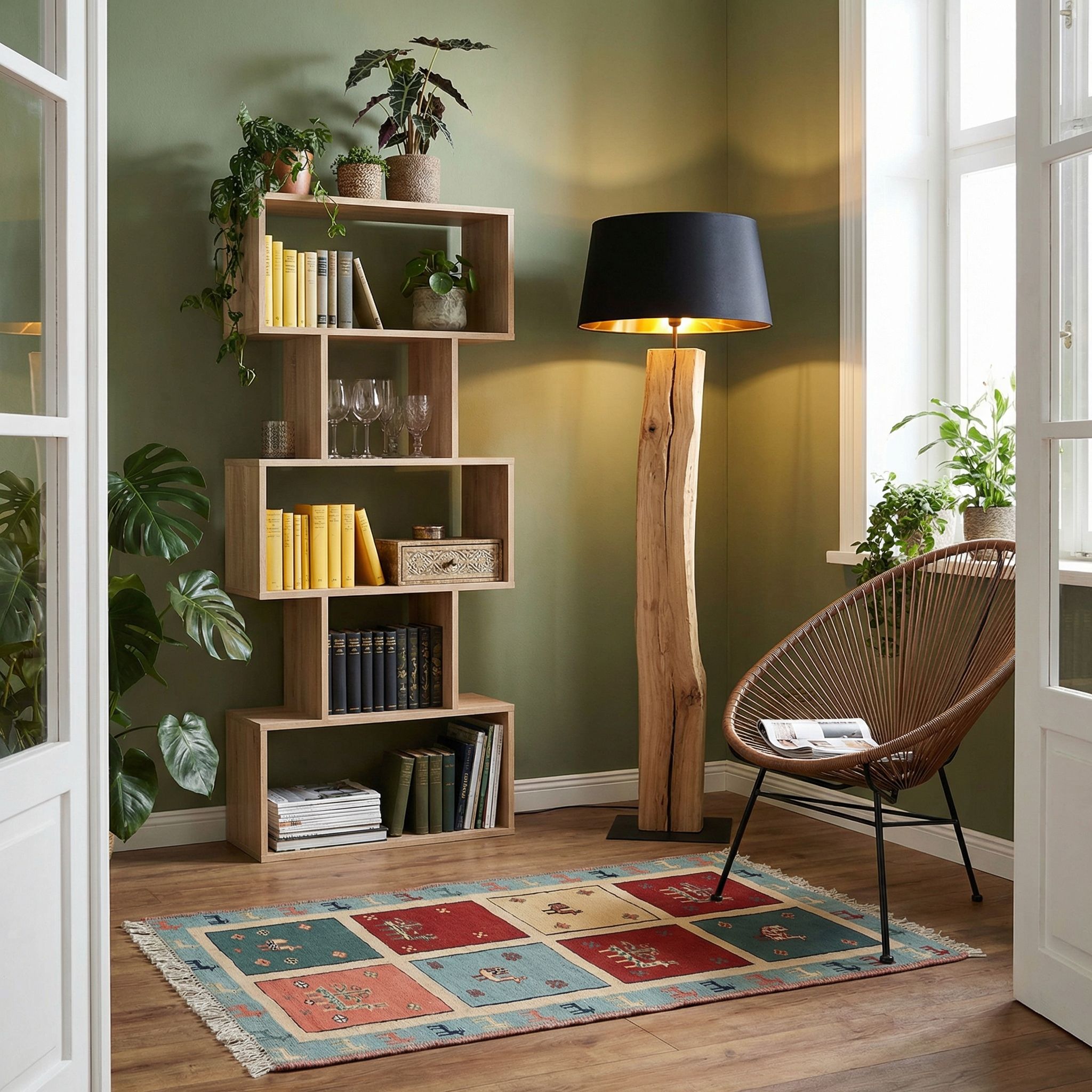 In einem loftartigen Industrial-Interieur bildet dieser handgefertigte Afschar-Tabii einen spannenden, weichen Kontrapunkt zu kühlem Beton, unverputztem Mauerwerk und schwerem Metall. Die außergewöhnliche Strapazierfähigkeit des Sumack-Kelims passt perfekt zum rauen, funktionalen Charme dieses Stils, während die hochwertige Schafwolle für akustische und optische Wohnlichkeit sorgt. Die kräftigen Rot- und Blautöne der Naturfarben leuchten vor dunklen Hintergründen besonders intensiv und beleben die oft monochrome Farbpalette des Industriestils auf kunstvolle Weise. Als authentisches Handwerksprodukt unterstreicht dieser Teppich den Wert von "Echtheit" und Materialqualität, was ihn zum idealen Partner für Vintage-Ledersofas und Fabrikleuchten macht.
