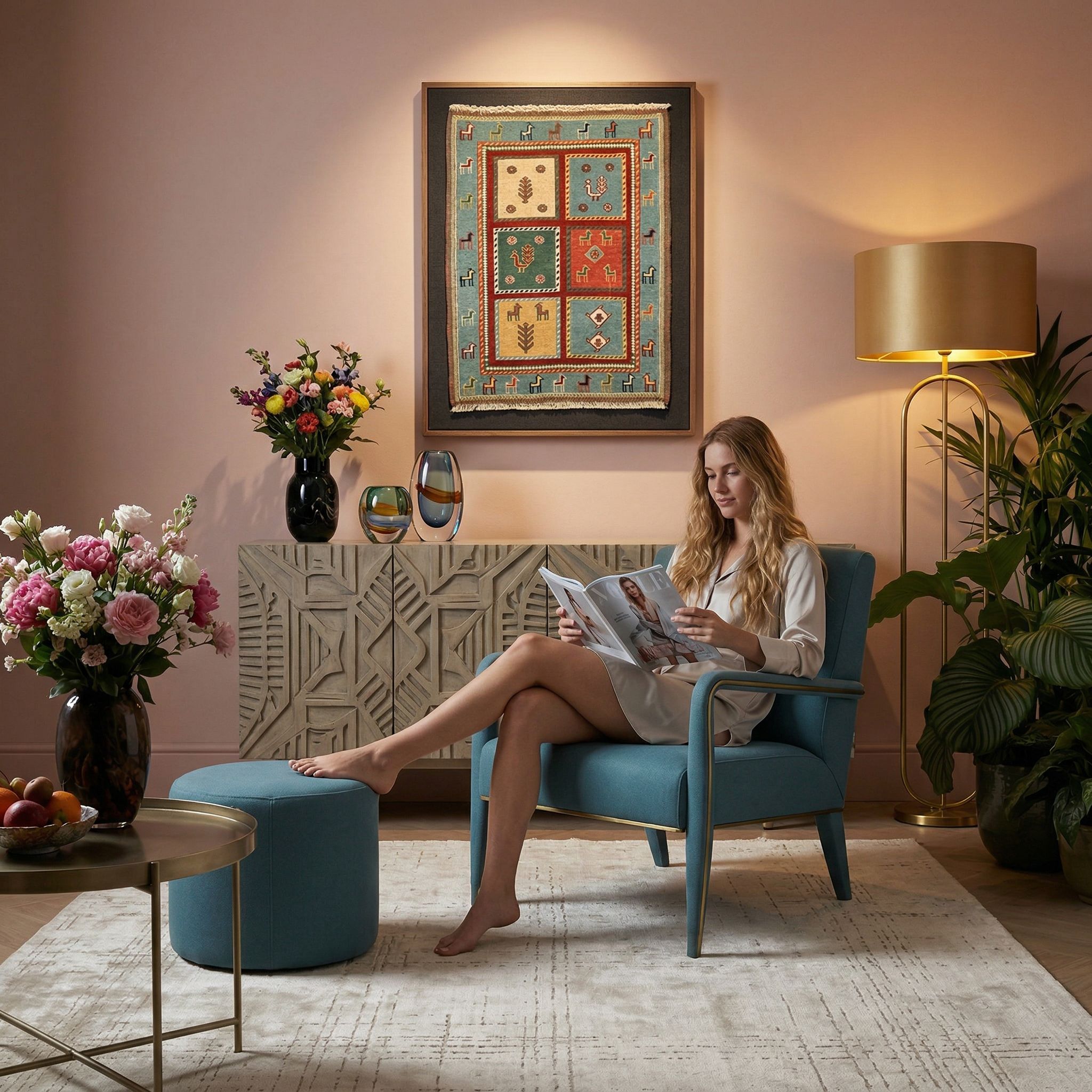 Die warmen Naturtöne und die haptische Qualität der handversponnenen Schafwolle harmonieren wunderbar mit den hellen Hölzern, Leinenstoffen und der natürlichen Ästhetik des New-Country-Looks. Das charmante Kachel-Design mit seinen ländlichen Motiven fügt sich nahtlos in ein modernes Landhaus-Ambiente ein und sorgt für sofortige Behaglichkeit. Da dieser Sumack-Kelim extrem strapazierfähig und langlebig ist, eignet er sich hervorragend für familiäre Wohnbereiche, in denen das Leben stattfindet. Er verbindet die Sehnsucht nach Ursprünglichkeit mit höchster Wohnqualität und macht Ihr Zuhause zu einem gemütlichen Rückzugsort.
