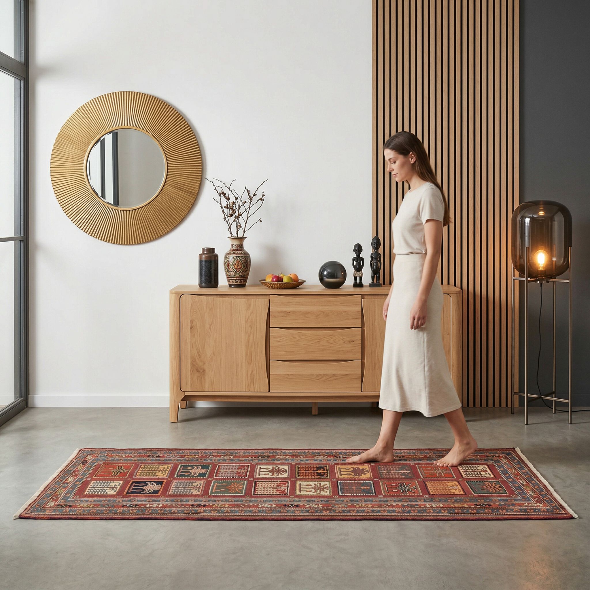 Obgleich der Skandi-Stil für Zurückhaltung bekannt ist, sorgt gerade dieser farbenfrohe Kelim für die nötige Prise „Hygge“ und Wärme in hellen, nordischen Räumen. Die geometrische Klarheit der quadratischen Muster fügt sich nahtlos in die skandinavische Designphilosophie ein, während die satten Naturfarben einen belebenden Kontrast zu weißen Wänden und hellem Holz bilden. Die haptische Qualität der feinen, handversponnenen Wolle bringt genau jene Textur und Gemütlichkeit, die ein cleanes Interieur erst wirklich wohnlich macht. Mit diesem Stück beweisen Sie, dass nordische Klarheit und orientalisches Handwerk eine wunderbar harmonische Symbiose eingehen können.