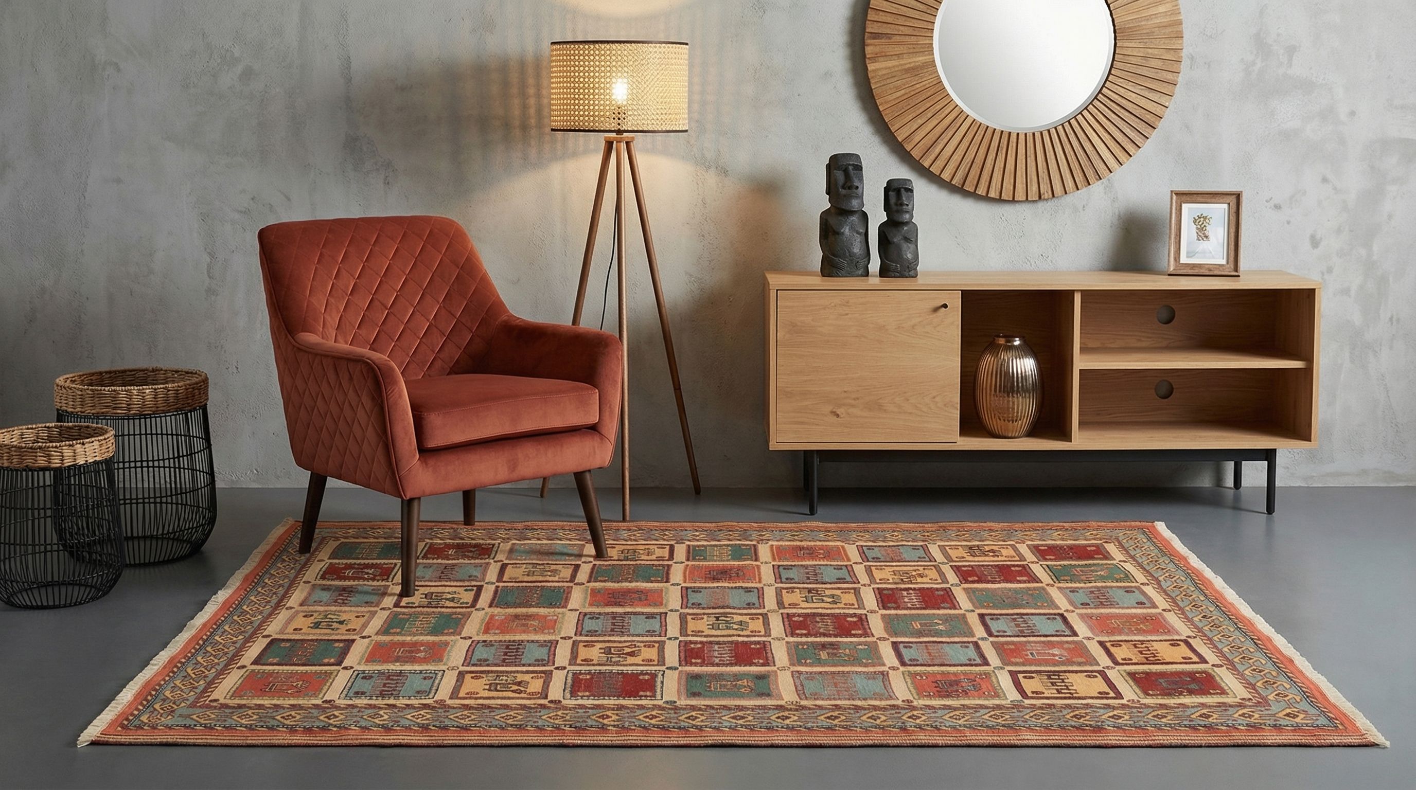 Hier präsentieren wir den Afschar-Tabii, einen handgeknüpften Sumack-Kelim aus dem Hause Mesgarzadeh. Die Hauptfarbe dieses Teppichs ist ein warmes, erdiges Rot, das durch ein harmonisches Zusammenspiel mit zarten Blautönen und einem kräftigen Gelb ergänzt wird. Zusätzlich verleihen Nuancen von Orange und Beige dem Teppich eine fröhliche, lebendige Ausstrahlung. Das geometrische Muster aus Quadraten enthält traditionelle Motive, die an die reiche Nomadenkunst Persiens ...mehr Beschreibung