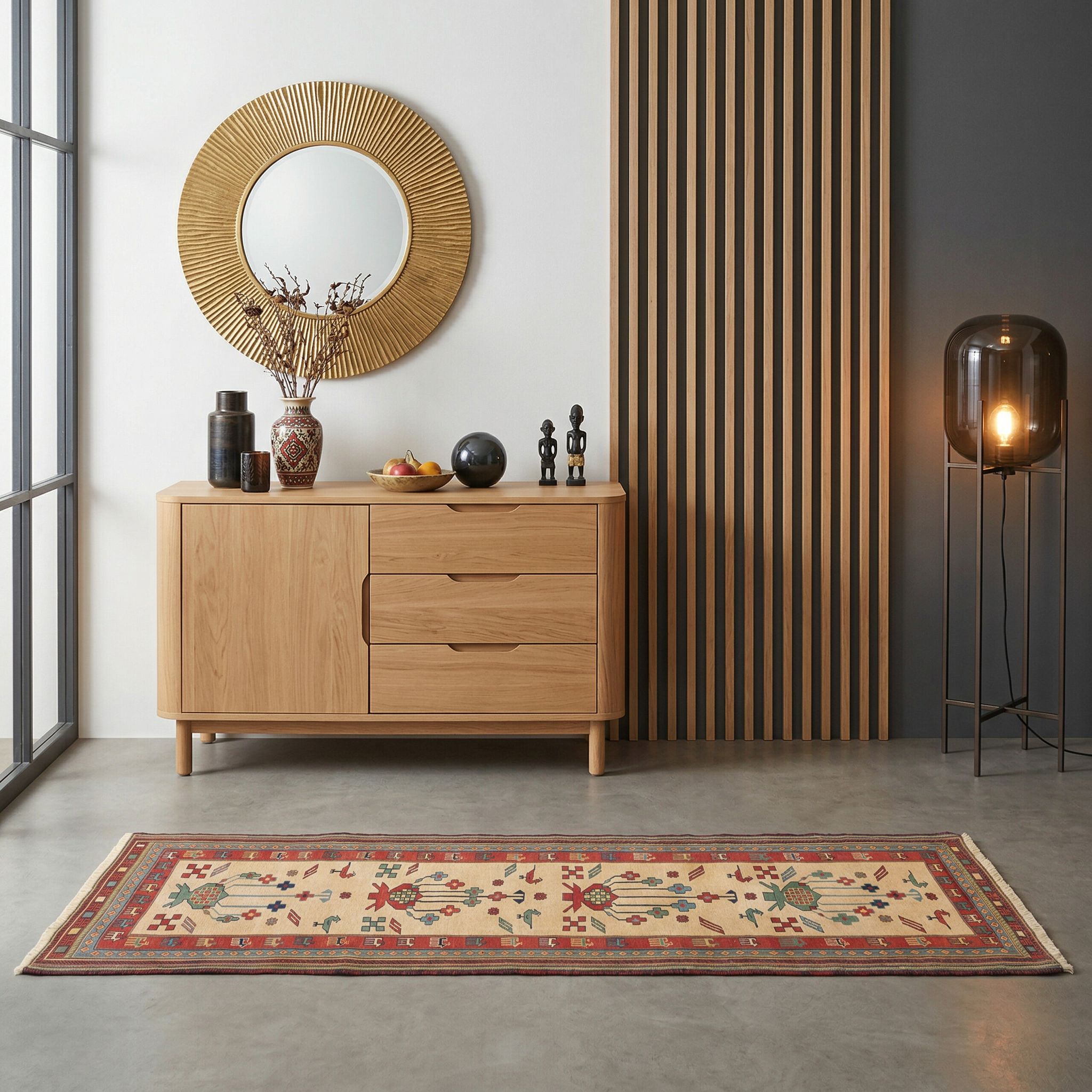 In einem modernen, geradlinigen Ambiente fungiert dieser feine Sumack-Kelim als exklusiver Stilbruch, der dem Raum durch seine handwerkliche Textur sofort Wärme und Tiefe verleiht. Das klare, geometrische Muster und die edle Qualität der handversponnenen Wolle bilden einen spannenden Kontrast zu glatten Oberflächen und minimalistischem Design. Als kuratiertes Einzelstück bricht er die Strenge des Contemporary-Styles auf und sorgt für eine galerieartige, anspruchsvolle Wohnatmosphäre. Setzen Sie mit diesem langlebigen Meisterwerk ein Statement für zeitlose Qualität, die sich nicht kurzlebigen Trends unterwirft, sondern bleibenden Wert besitzt.