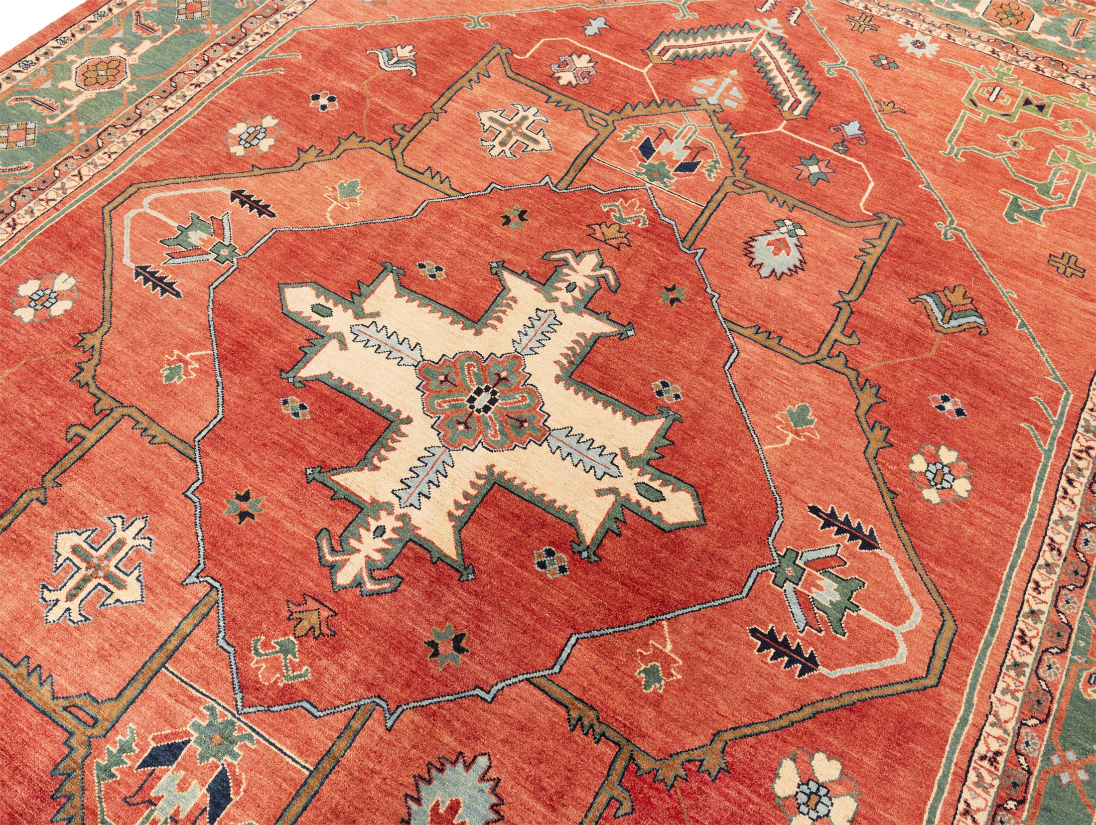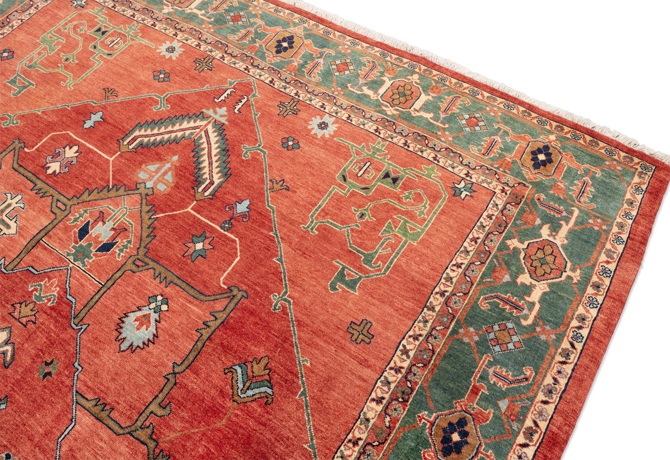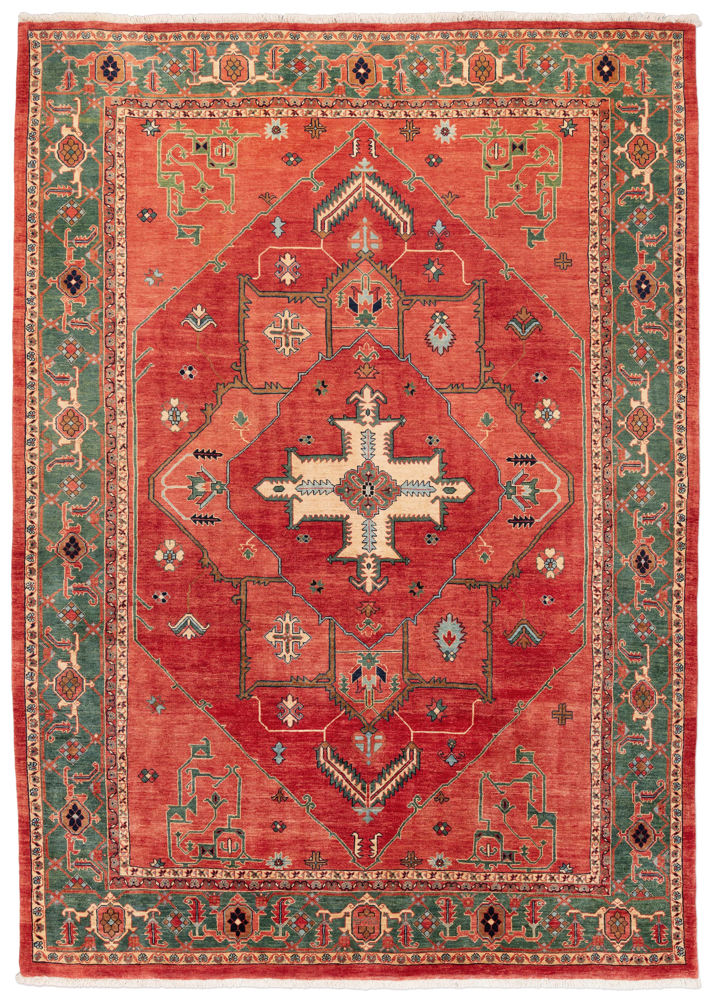 Der handgeknüpfte Ghadimi-Teppich aus dem Hause Mesgarzadeh besticht durch seine Hauptfarbe Rot, die ihm eine warme und einladende Ausstrahlung verleiht. Ergänzt wird diese intensive Farbe durch Akzente in Grün und Beige, die das harmonische Gesamtbild abrunden. Die Muster des Teppichs sind komplex und traditionell, inspiriert von den Heriz-, Serapi- und Bachshayesch-Designs. Diese einzigartigen Muster zeugen von der hohen Kunstfertigkeit und Kreativität der Knüpfer. Hergestellt aus ...mehr Beschreibung