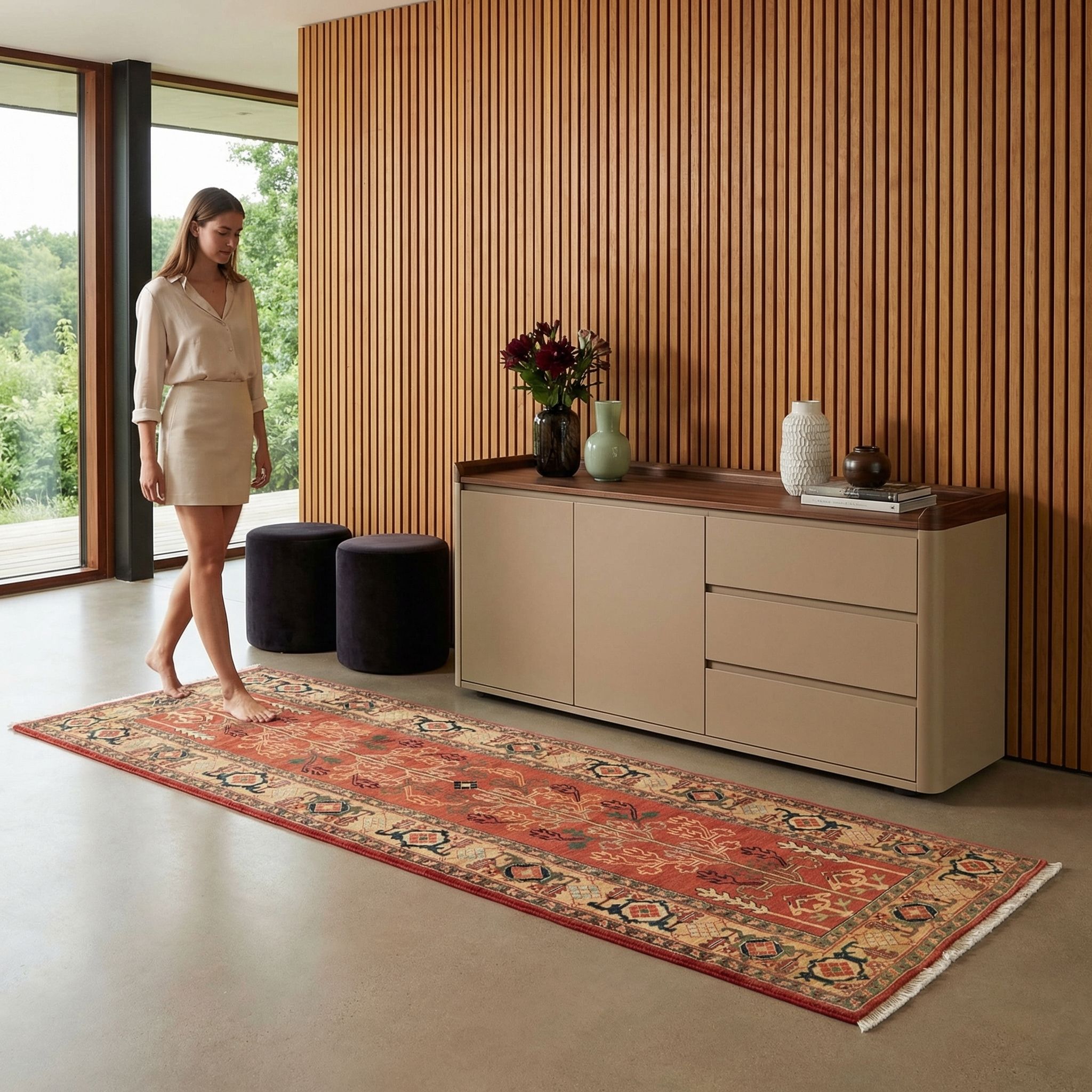 In einem modernen, zeitgenössischen Umfeld wirkt dieser Teppich als kuratiertes Kunstwerk, das "zeitgemäß ist, ohne modischen Strömungen zu folgen". Die klare, fast grafische Reduktion der antiken Vorlagen passt hervorragend zu den klaren Linien moderner Designmöbel und verhindert, dass der Raum steril wirkt. Durch die Nuancen der Naturfarben (Abrash) bringt er eine subtile Lebendigkeit ein, die von Kennern als Zeichen höchster Qualität und Exklusivität geschätzt wird. Er verbindet Vergangenheit und Gegenwart in harmonischer Schönheit und verleiht einem minimalistischen Raum Seele und Geschichte.