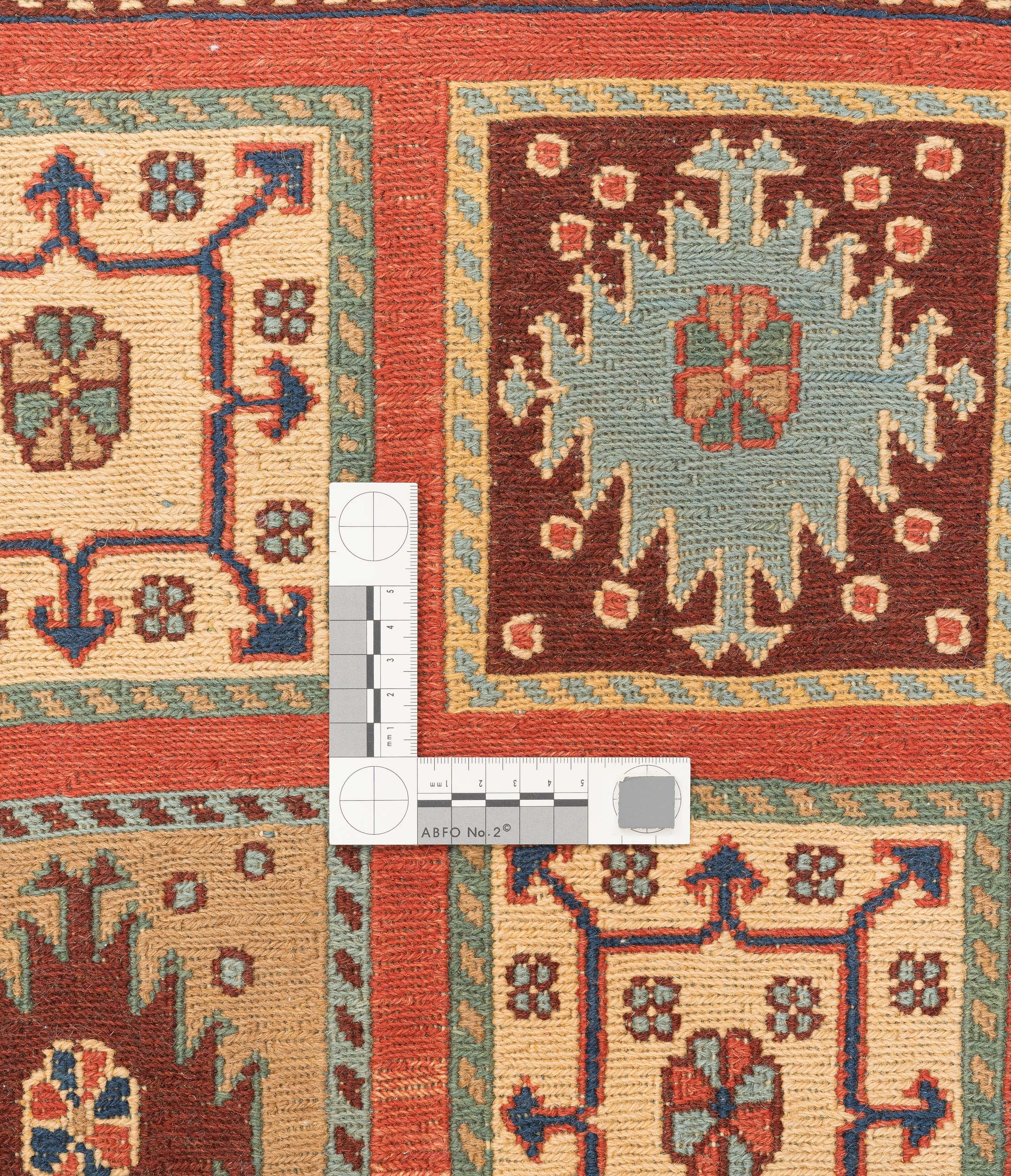 Die Musterung ist klar gegliedert: Im Mittelfeld liegen regelmäßig angeordnete, rechteckige Kassetten, jede mit einem zentralen Rosettenmotiv und gezackten, rautenartigen Medaillons sowie kleinen Haken und Blütenelementen. Eine markante Hauptbordüre mit stilisierten, repetitiven Zeichen umrahmt das Ganze, ergänzt durch schmale Nebenbordüren mit Zickzack und Linienornamentik. Gefertigt ist dieses Original aus dem Hause Mesgarzadeh im sehr feinen, robusten Sumack Verfahren mit handversponnener Schafwolle und reiner Handarbeit. Die Knotendichte liegt bei etwa 150000 bis 200000 Knoten pro Quadratmeter. Sumack Kelims liegen besonders gut am Boden, auf glatten Untergründen empfiehlt sich eine rutschfeste Teppichunterlage.