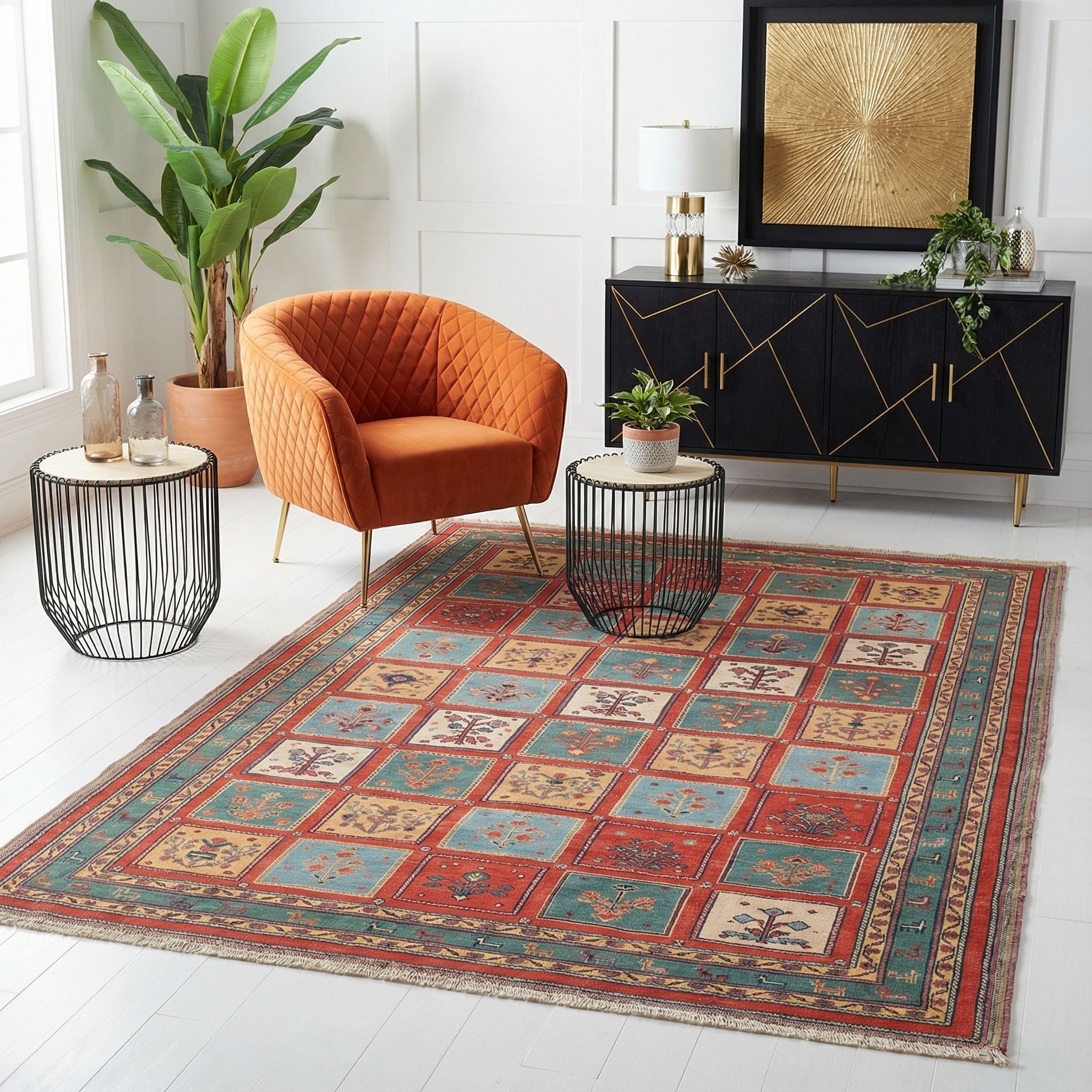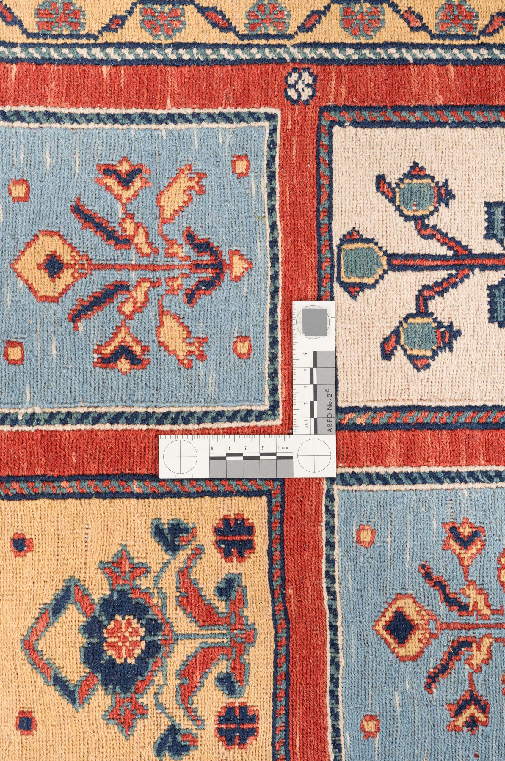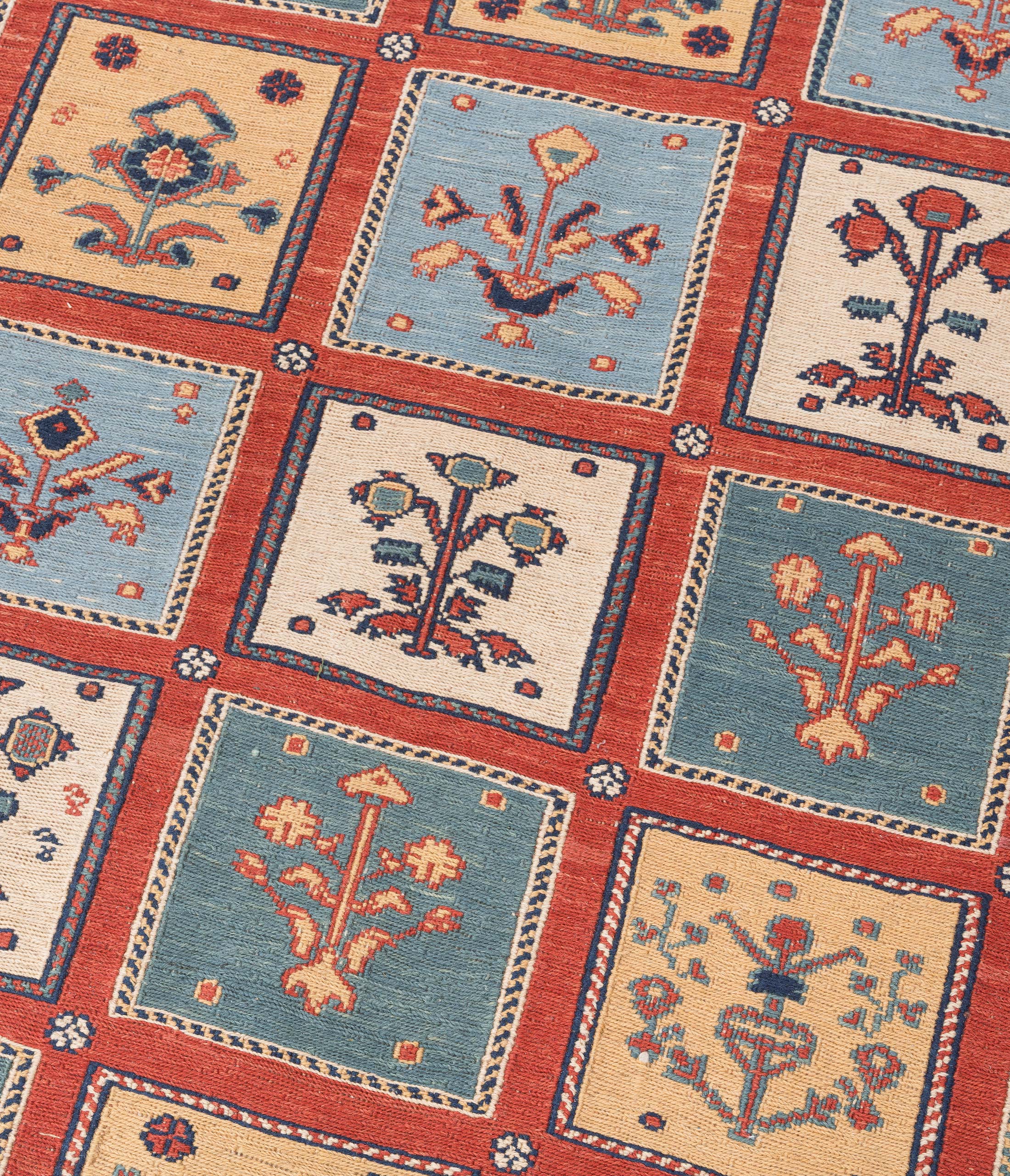 Das Muster des Teppichs besteht aus einer Vielzahl von quadratischen Feldern, die jeweils mit unterschiedlichen floralen und geometrischen Motiven geschmückt sind. Diese Wiederholung von Mustern verleiht dem Teppich eine strukturierte und dennoch dynamische Optik. Die floralen Elemente sind fein ausgearbeitet und tragen zur traditionellen Anmutung des Teppichs bei.