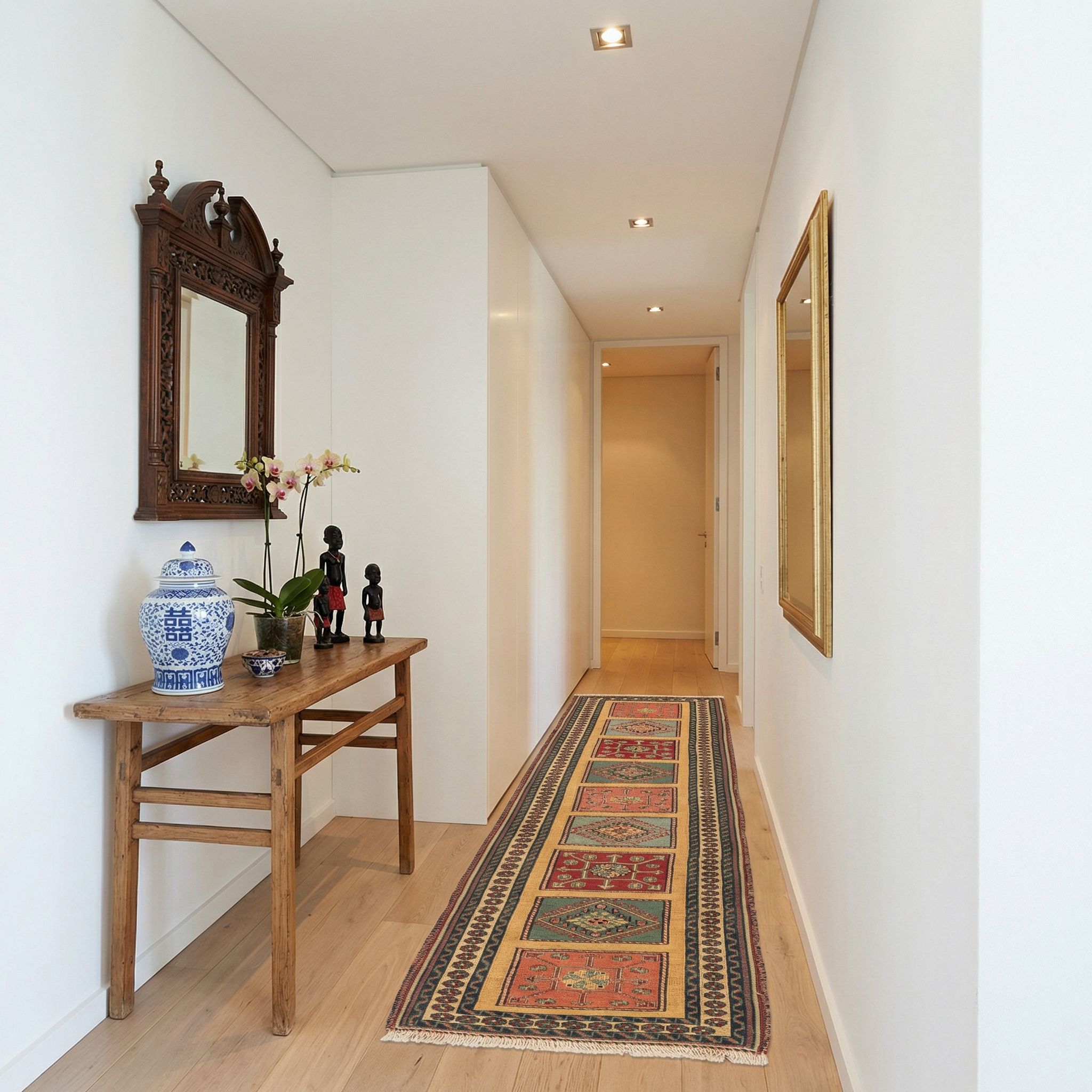 Dieser farbenfrohe Kelim dient als bewusster Kontrapunkt zur nordischen Zurückhaltung und bringt die nötige Portion "Hygge" und Wärme in ein sonst eher monochromes, helles Interieur. Die grafischen Muster des Afschar-Tabii greifen die skandinavische Vorliebe für klare Formen auf, während die Naturfarben den Raum beleben, ohne ihn zu überladen. Durch seine flache, aber feste Struktur passt er hervorragend zur funktionalen Ästhetik des Scandi-Designs und lockert weiße oder graue Wohnlandschaften stilvoll auf. Er ist das perfekte Accessoire, um Individualität zu zeigen und die kühle Eleganz des Nordens mit handwerklicher Wärme zu verbinden.