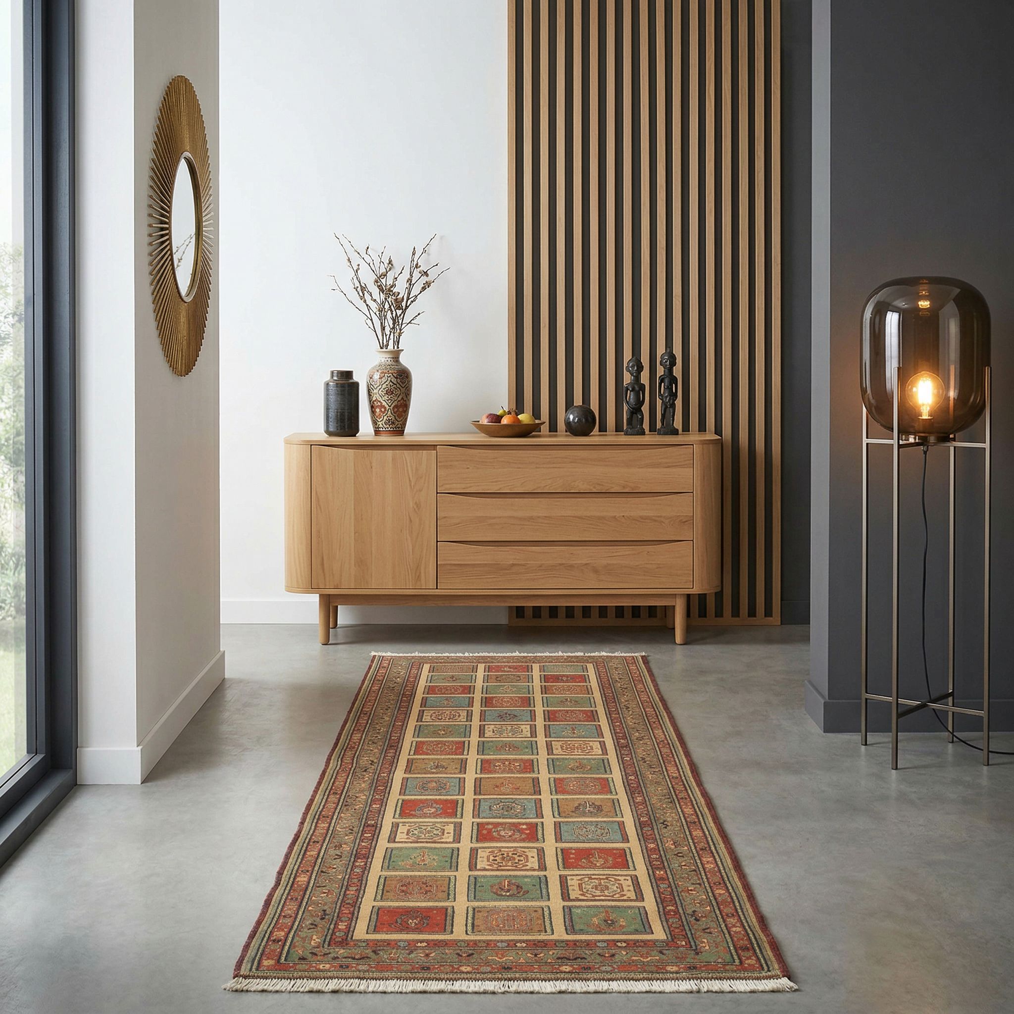In einem modernen, reduzierten Ambiente wirkt dieser feine Sumack-Kelim als exklusiver Blickfang und sorgt für einen spannenden, stilvollen Kontrast. Die klare geometrische Aufteilung des Musters harmoniert überraschend gut mit geradlinigem Design, während die handwerkliche Textur dem Raum die nötige Wärme verleiht. Als hochwertiges Unikat unterstreicht er Ihren Anspruch an Qualität und zeitlose Eleganz fernab von industrieller Massenware. Dieser bewusste Stilbruch bricht die kühle Strenge des Contemporary-Looks auf und schafft eine Atmosphäre von kuratiertem Luxus.