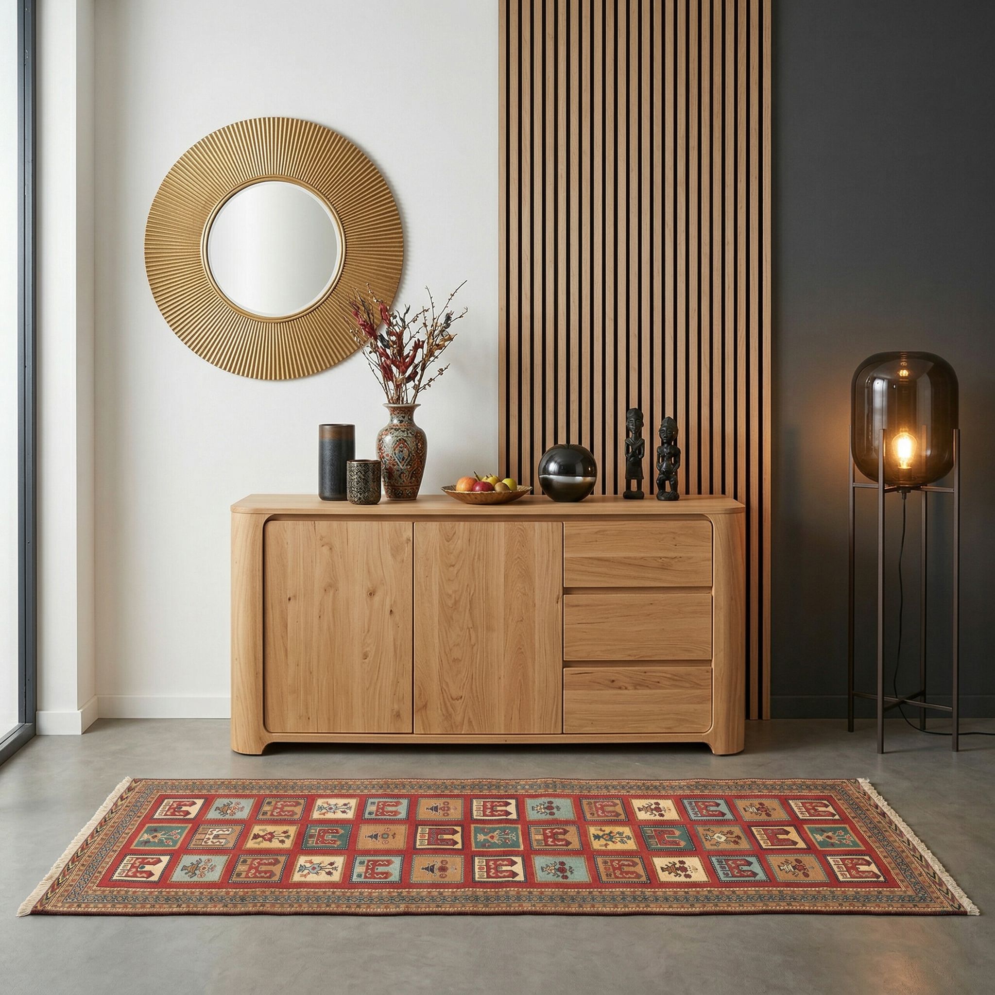 Als bewusster Stilbruch im rauen Industrial-Look wirkt dieser feine Sumack-Kelim wahre Wunder, indem er die Kühle von Beton, Stahl und unverputztem Mauerwerk weich abfedert. Die intensiven Naturfarben und die reiche Geschichte des Nomadenmusters erzeugen eine faszinierende Spannung zum rohen, unfertigen Fabrik-Charme. Die extreme Strapazierfähigkeit der geknoteten Wickeltechnik hält dabei problemlos mit dem robusten Charakter von Industriemöbeln mit. Mit diesem Meisterwerk fügen Sie Ihrem Loft eine Ebene von Wärme und kulturellem Anspruch hinzu, die den Raum wohnlich macht.
