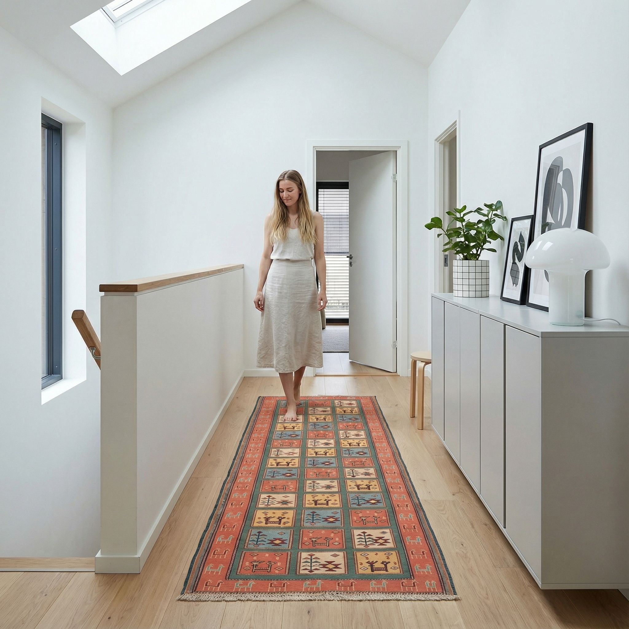 Hier präsentieren wir den Afschar-Tabii, einen exquisiten Sumack-Kelim aus Persien, der in einer einzigartigen Farbkombination erstrahlt. Die Hauptfarbe ist ein warmes Rot, das den Teppich durchzieht und ihm eine lebendige Ausstrahlung verleiht. Begleitet wird es von einem tiefen Blau, einem sanften Beige und einem erdigen Grün, die zusammen ein harmonisches Gesamtbild schaffen. Diese Farbstellung wird durch die Verwendung von Naturfarben erreicht, was dem Teppich eine authentische und ...mehr Beschreibung