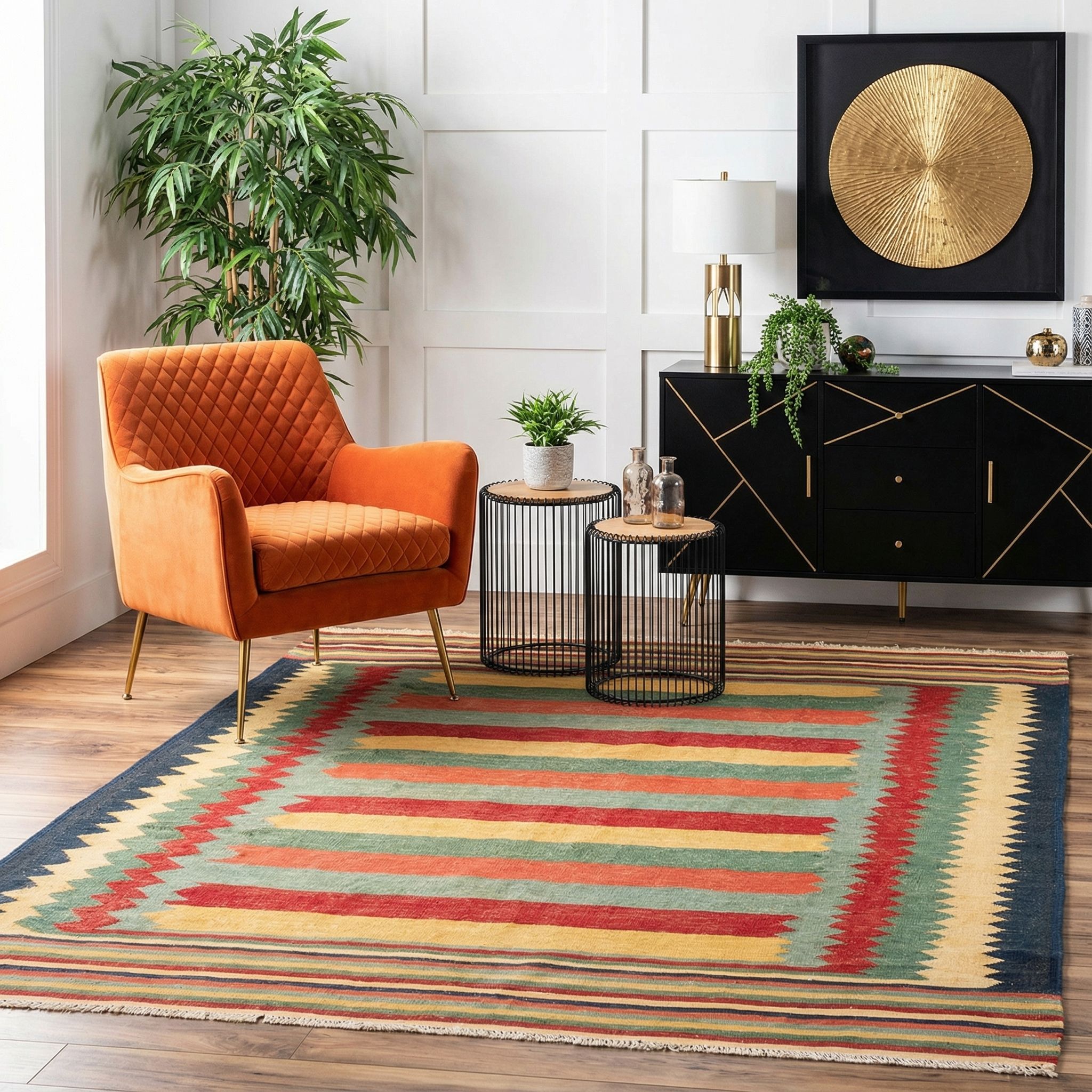 In einem skandinavisch geprägten Ambiente fungiert dieser Kelim als wärmender Anker, der die kühle Zurückhaltung des Nordens mit behaglicher "Hygge"-Atmosphäre füllt. Die klare, fast grafische Linienführung des Designs korrespondiert wunderbar mit der schlichten Formensprache nordischer Möbel, während die bunten Naturfarben einen spannenden, lebendigen Kontrast zu hellen Hölzern bilden. Durch die hochwertige, handversponnene Schafwolle bringt der Teppich jene haptische Qualität und Natürlichkeit ein, die im Scandi-Style so sehr geschätzt wird. Er bricht die visuelle Strenge sanft auf und verleiht dem Raum eine individuelle Note, ohne die minimalistische Grundordnung zu stören.