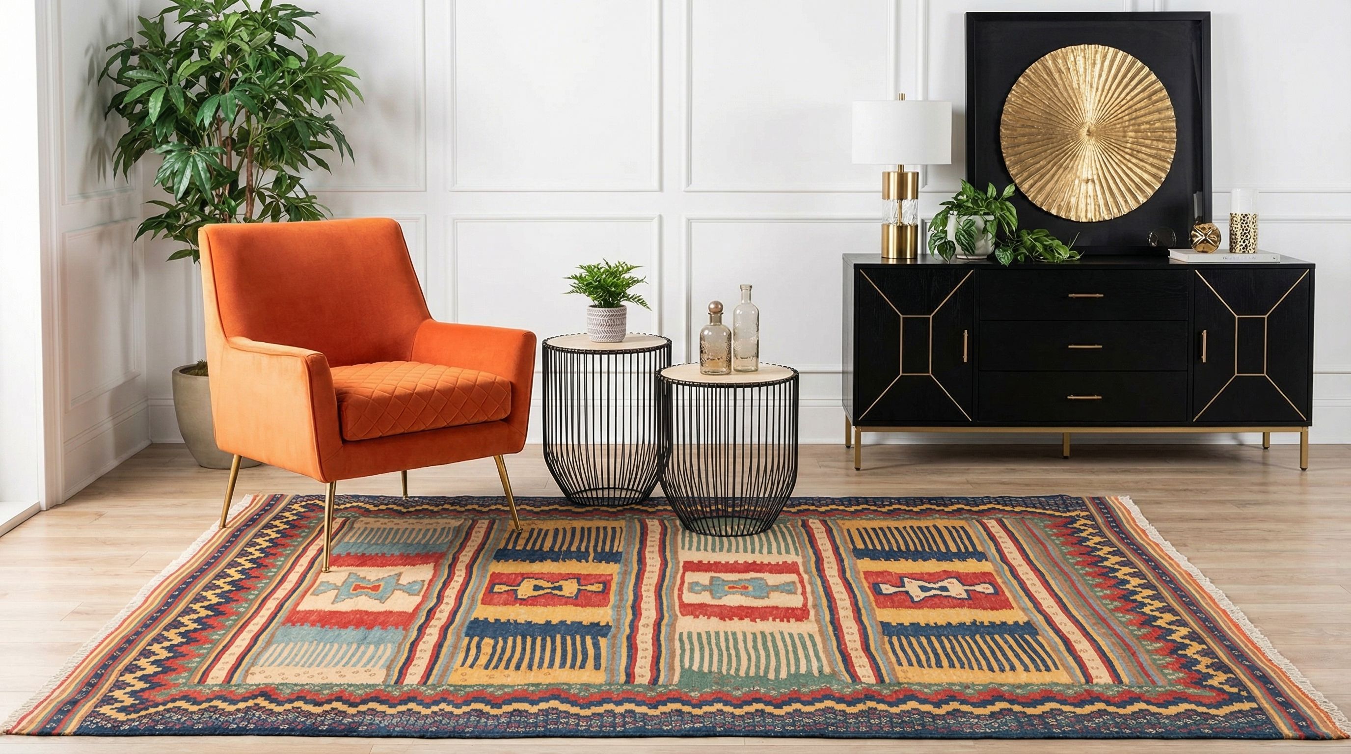 Handgewebte Kelims werden auf einem Webstuhl hergestellt, welcher zuerst aus horizontalen aufgespannten Fäden (der Kette) besteht. Die Kette kann aus Baumwolle oder Schafwolle oder in seltenen Fällen aus Seide bestehen. Durch die Kette wird dann vertikal (der Schuss) ab wechselnd oberhalb und unterhalb der Kette durchgezogen. Der Webvorgang ist relativ einfach, aber er erfordert Geschick und Erfahrung, um ein gleichmäßiges und kunstvolles Bildmuster zu erzeugen. Die Qualität und ...mehr Infos zur Handarbeit