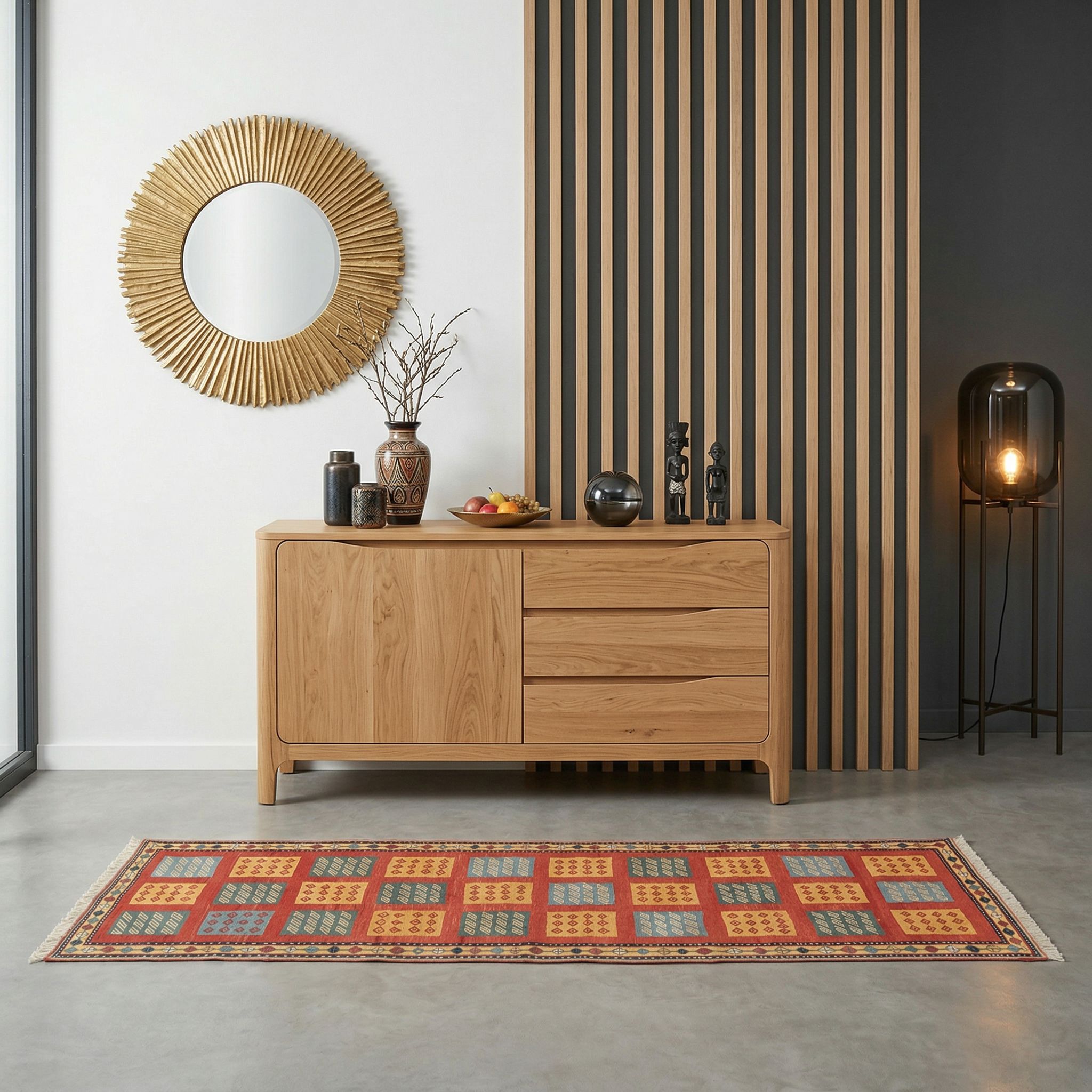 Die lebendigen Naturfarben und das geometrische Nomaden-Muster dieses Afschar-Tabii fügen sich nahtlos in die entspannte, kreative Atmosphäre des Boho-Styles ein. Mit seiner handversponnenen Schafwolle und der einzigartigen Struktur bringt er genau jene gewünschte Wärme und authentische Handwerkskunst mit, die diesen unkonventionellen Look definiert. Die kunstvolle Wickeltechnik macht ihn zu einem haptischen Erlebnis, das zum Barfußlaufen einlädt und die lässige Gemütlichkeit Ihrer Einrichtung unterstreicht. Als echtes Unikat erzählt er eine Geschichte von Tradition, die Ihre Sammlung aus Rattanmöbeln, Pflanzen und Vintage-Fundstücken perfekt ergänzt.