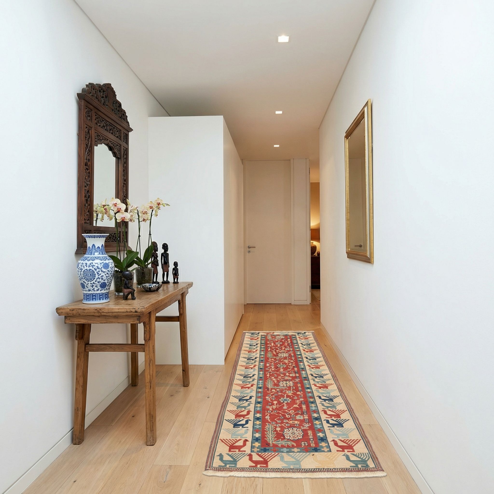 In einem modernen, geradlinigen Ambiente fungiert dieser exquisite Läufer als bewusster Stilbruch und wird zum exklusiven Kunstwerk auf dem Boden. Die grafisch anmutenden Vogel-Motive und die klare geometrische Aufteilung der Bordüre setzen einen spannenden Kontrast zu schlichten Möbeln und glatten Oberflächen. Dank der hochwertigen Verarbeitung und der feinen Sumack-Technik genügt der Teppich höchsten Qualitätsansprüchen und unterstreicht den Luxus eines kuratierten Contemporary-Interieurs. Er bringt genau das richtige Maß an Farbe und Textur ein, um strenge Architektur aufzulockern, ohne die visuelle Ruhe zu stören.