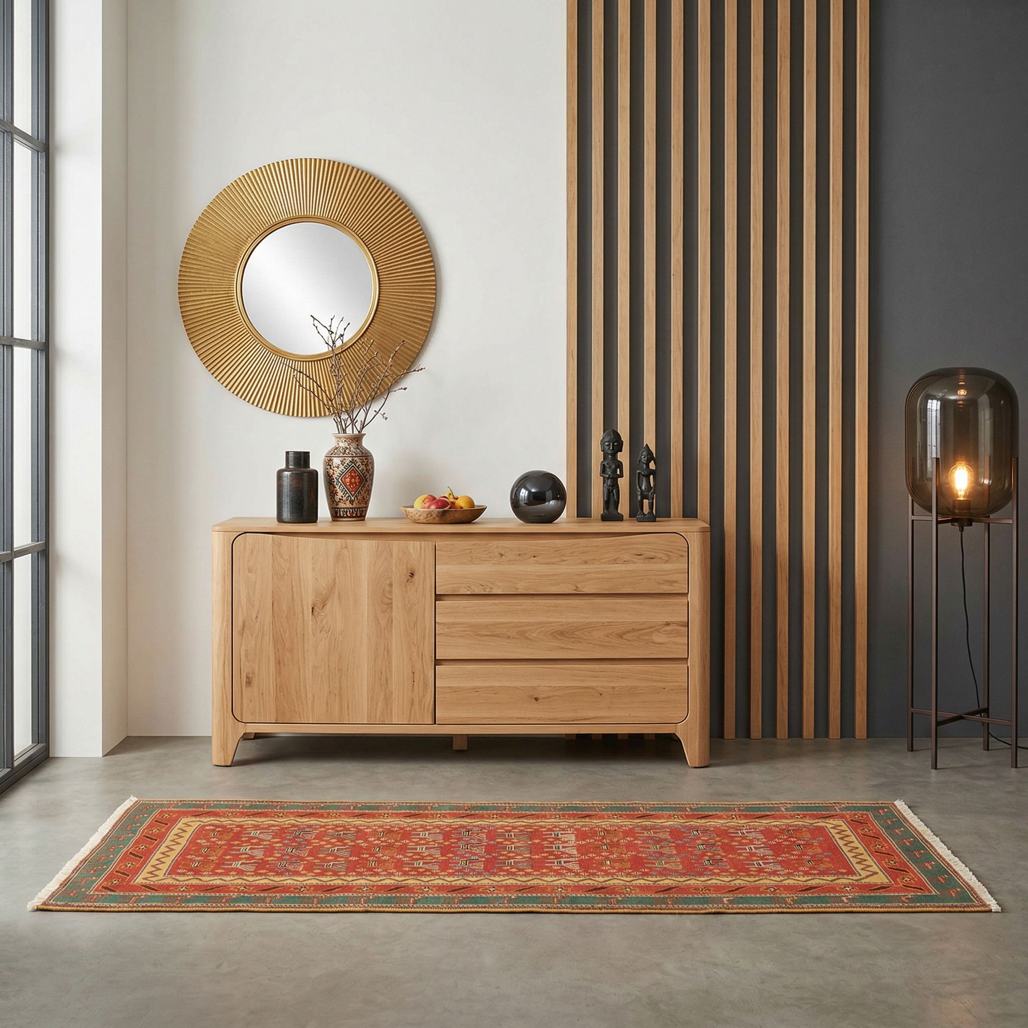 Im rauen Industrial-Style bildet dieser robuste Sumack-Kelim einen spannenden Gegenpol zu kühlem Beton, unverputztem Mauerwerk und schweren Metallelementen. Die lebendigen Farben und die weiche Haptik der handversponnenen Wolle brechen die Härte des Loft-Looks auf und machen den Raum sofort wohnlicher und exklusiver. Seine extreme Strapazierfähigkeit und die solide Verarbeitung halten der rohen, funktionalen Ästhetik stand und beweisen, dass Feinheit und Industrie koexistieren können. Dieser Teppich wirkt wie eine farbige Insel im urbanen Dschungel, die Geschichte und Handwerkskunst in die moderne Fabrikatmosphäre bringt.