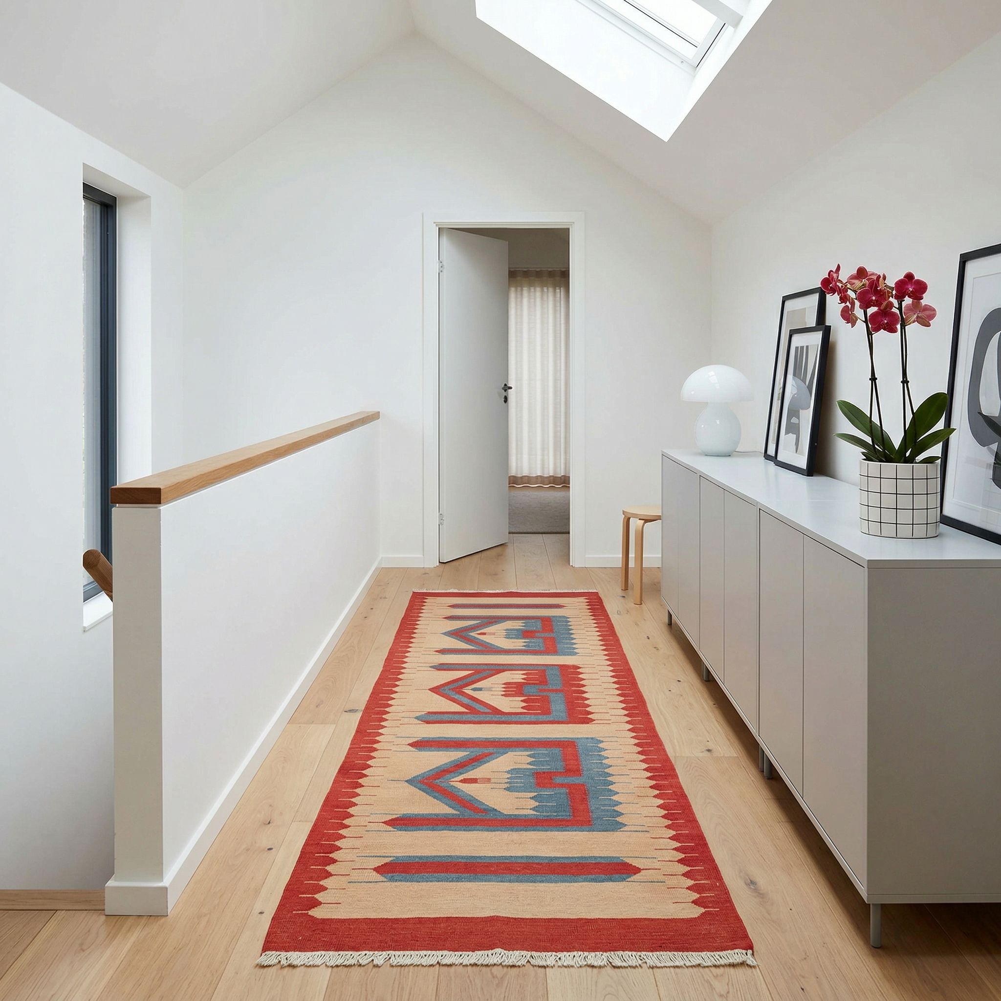 Als bewusster Stilbruch im cleanen Scandinavian-Style durchbricht dieser Kelim die oft monochrome Farbpalette und sorgt für eine unverzichtbare Dosis „Hygge“. Die klare, geometrische Linienführung des modernen Designs korrespondiert hervorragend mit der schlichten Formensprache nordischer Möbelklassiker, während die Farben Leben in den Raum bringen. Gleichzeitig bringt die hochwertige, reine Schafwolle eine natürliche Wärme und haptische Tiefe in den Raum, die kühle Weiß- und Grautöne sanft aufbricht. Dieser Teppich fungiert als geschmackvoller Fokuspunkt, der Minimalismus mit wohnlicher Geborgenheit verbindet.