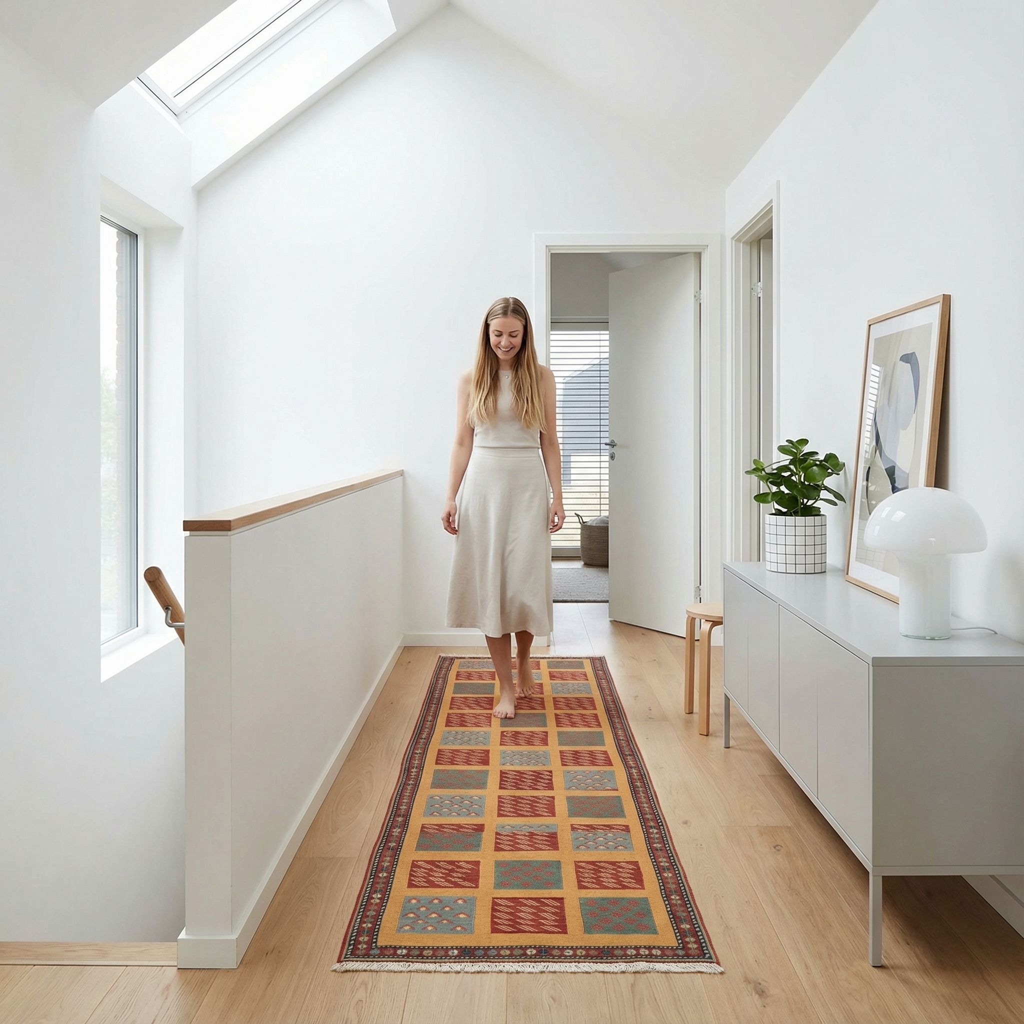 Hier präsentieren wir den exquisiten Afschar-Tabii Sumack-Kelim, ein wahres Meisterwerk der persischen Teppichkunst. Die Hauptfarbe dieses beeindruckenden Stücks ist ein warmes Goldgelb, das die Grundlage für die harmonische Farbkomposition bildet. Darauf folgen ein lebhaftes Rot und ein dezentes Blaugrün, die in einem faszinierenden Wechselspiel miteinander harmonieren. Diese Farbkombination wird durch ein tiefes Marineblau in der Bordüre ergänzt, welches dem Teppich zusätzliche Tiefe ...mehr Beschreibung