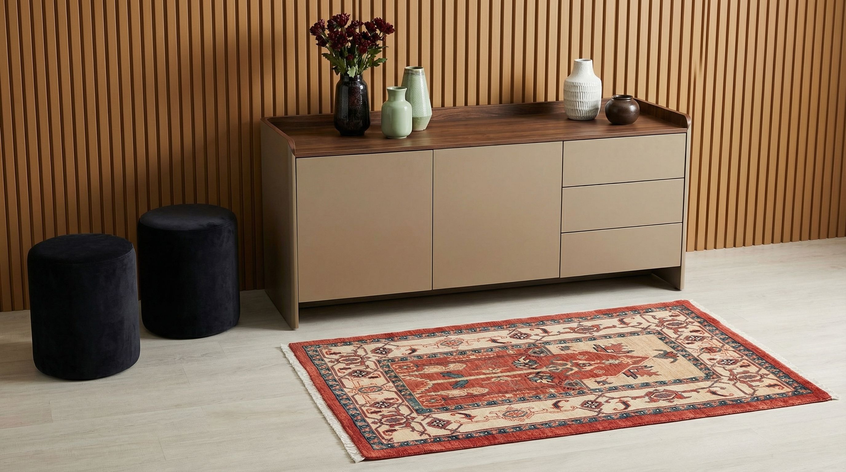 Hier präsentieren wir Ihnen einen handgeknüpften Ghadimi-Teppich aus dem Hause Mesgarzadeh, der durch seine meisterhafte Qualität und elegante Farbgebung besticht. Die Hauptfarbe dieses Teppichs ist ein kräftiges Rostrot, das den zentralen Bereich dominiert. Begleitet wird es von einem sanften Cremeweiß, das in den Rändern und Akzenten Verwendung findet, und einem tiefen Petrolblau, das die Musterung elegant umrahmt.Das Design des Teppichs ist durch traditionelle Heriz- und ...