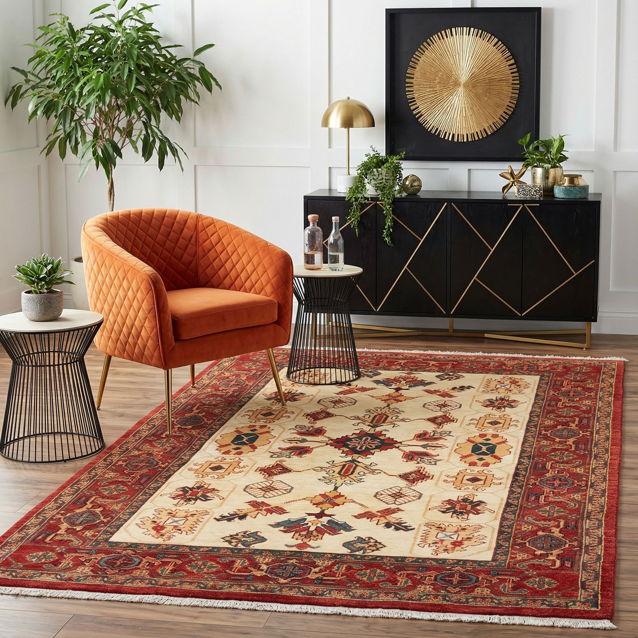 Dieser handgeknüpfte Ghadimi-Teppich aus dem Hause Mesgarzadeh präsentiert sich in einem warmen, kräftigen Rot als Hauptfarbe, das die reiche Tradition persischer Teppichkunst widerspiegelt. Ergänzt wird diese eindrucksvolle Farbgebung durch ein angenehmes Creme, das die Basis des Designs bildet, sowie Akzente in tiefem Blaugrün, die dem Gesamtbild eine harmonische Tiefe verleihen. Die Musterung ist inspiriert von antiken Heriz- und Serapi-Designs, deren geometrische und florale Elemente ...mehr Beschreibung