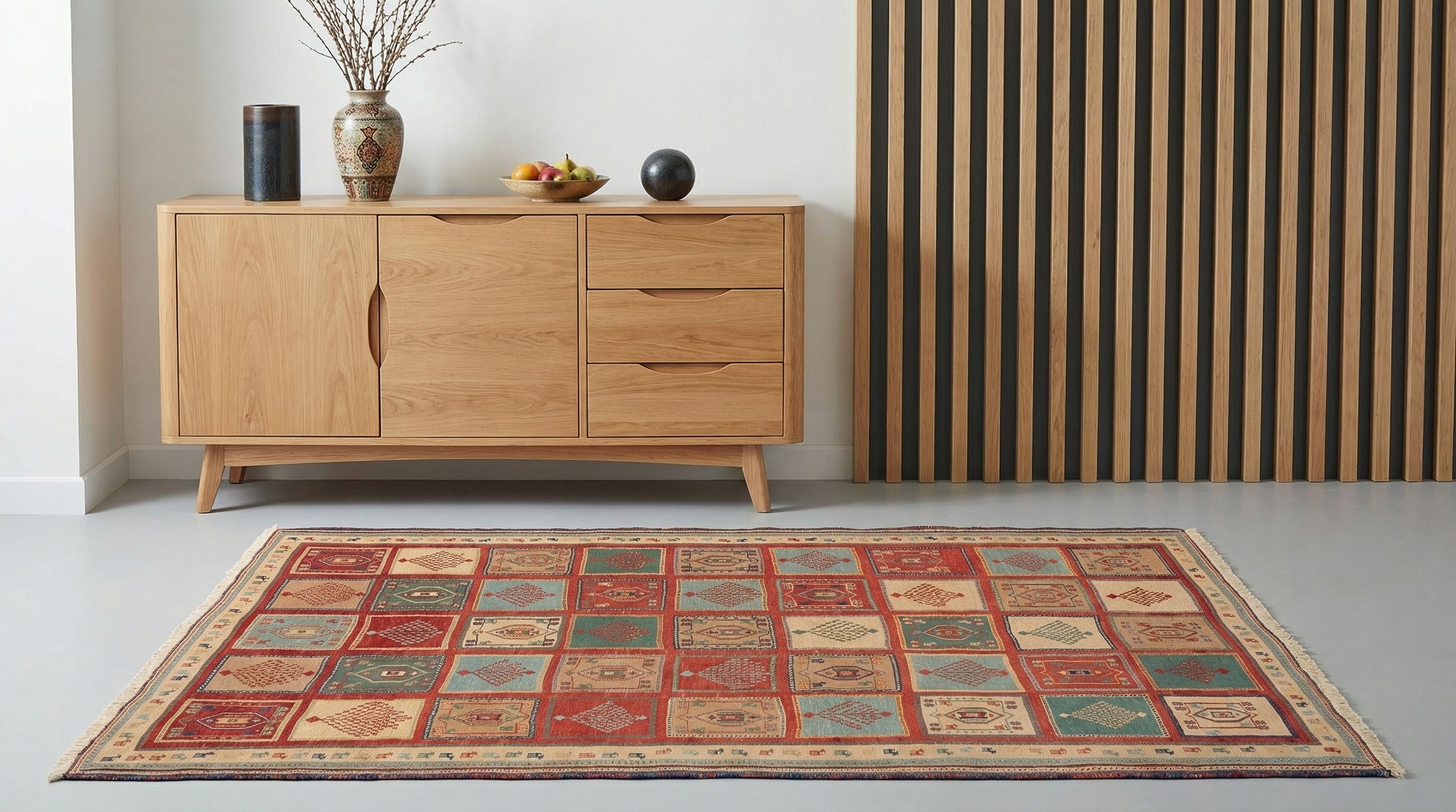 Der Afschar-Tabii Sumack-Kelim präsentiert sich in einer harmonischen Farbkomposition, die das Auge sofort gefangen nimmt. Die Hauptfarbe ist ein kräftiges Rot, das Wärme und Intensität ausstrahlt. Begleitet wird es von einem tiefen Grün, das Ruhe und Naturverbundenheit vermittelt. Ein sanftes Beige ergänzt das Farbspektrum, indem es dezent zurücktritt und den kräftigeren Tönen Raum gibt. Ein zartes Blau fügt eine kühle, erfrischende Note hinzu. Diese vier Farben dominieren das ...mehr Beschreibung