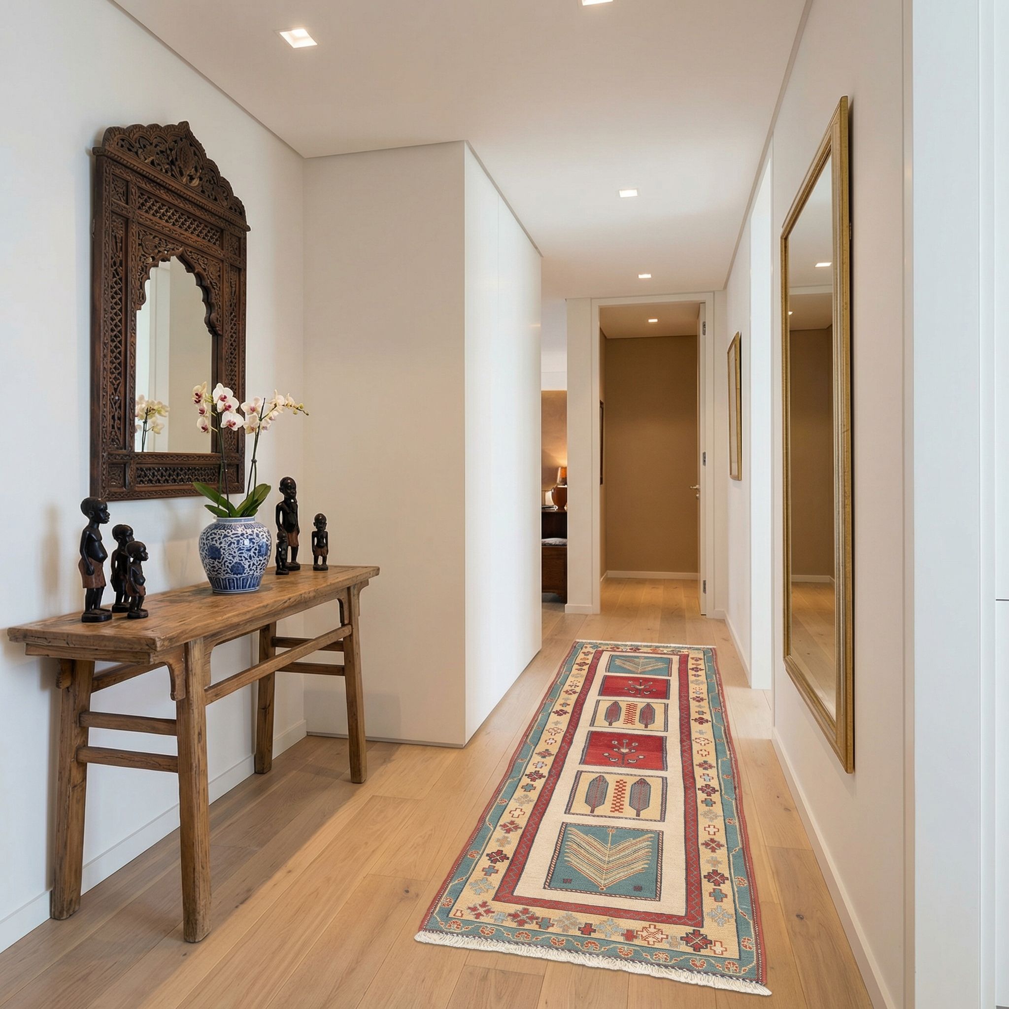 Als exklusiver Kontrast zu klaren Linien und kühlen Oberflächen fungiert dieser feine Sumack-Kelim als raffinierter Stilbruch im modernen Contemporary-Ambiente. Die grafische Klarheit der blockartigen Musterung harmoniert überraschend gut mit moderner Architektur, während die handversponnene Wolle dem Raum die notwendige Weichheit und Wärme verleiht. Dieses Meisterwerk aus dem Hause Mesgarzadeh dient als kuratiertes Kunstobjekt am Boden, das die Strenge des Minimalismus aufbricht, ohne die Balance zu stören. Er beweist, dass wahre Designqualität zeitlos ist und schlägt eine Brücke zwischen jahrhundertealter Tradition und heutigem Wohnkomfort.