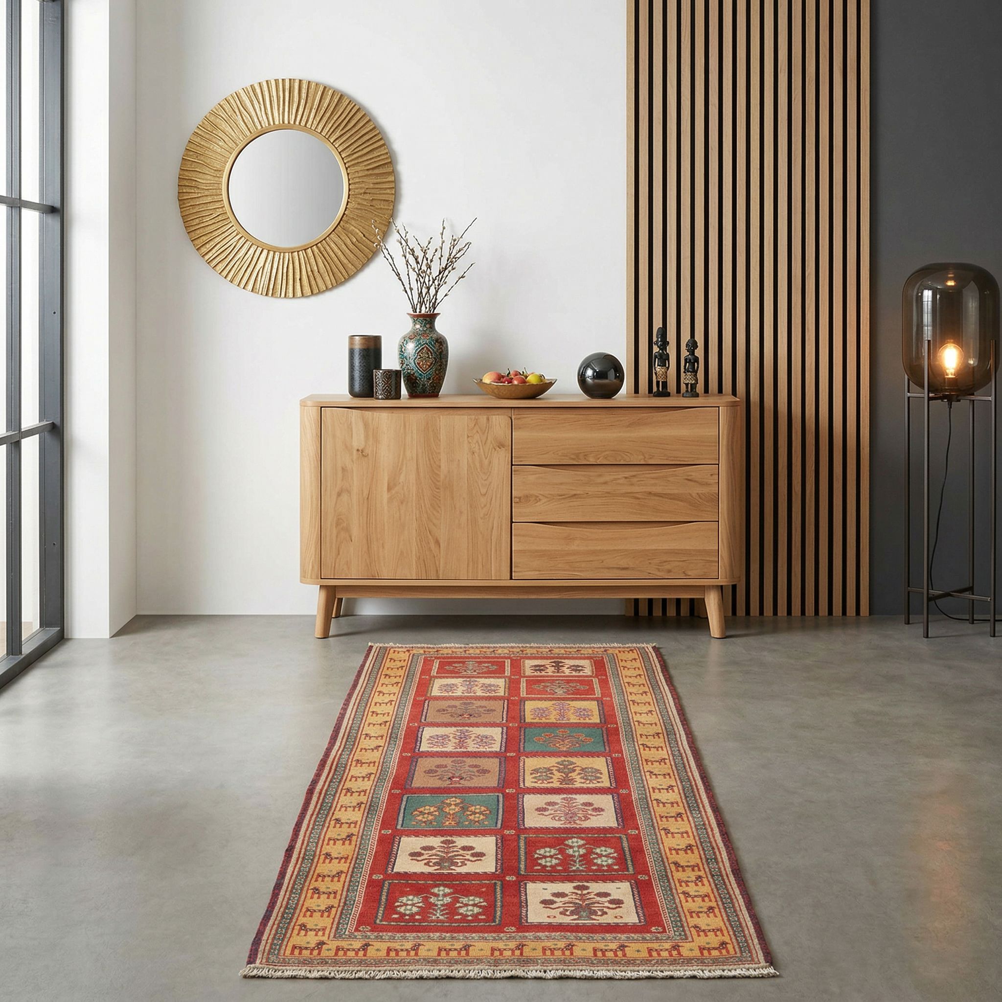 Die warmen Naturfarben und die kunstvollen Nomadenmuster dieses Kelims fügen sich nahtlos in die entspannte und kreative Atmosphäre des Boho-Styles ein. Die handversponnene Schafwolle sorgt für genau jene authentische Textur und Lebendigkeit, die diesen unkonventionellen Wohnstil ausmacht. Mit seiner erzählerischen Vielfalt aus floralen Motiven und Tierdarstellungen wird dieser Sumack-Kelim zum seelenvollen Herzstück Ihres Raumes. Er unterstreicht die Liebe zum Handwerk und zur individuellen Freiheit, die den Boho-Look so einzigartig und gemütlich macht.