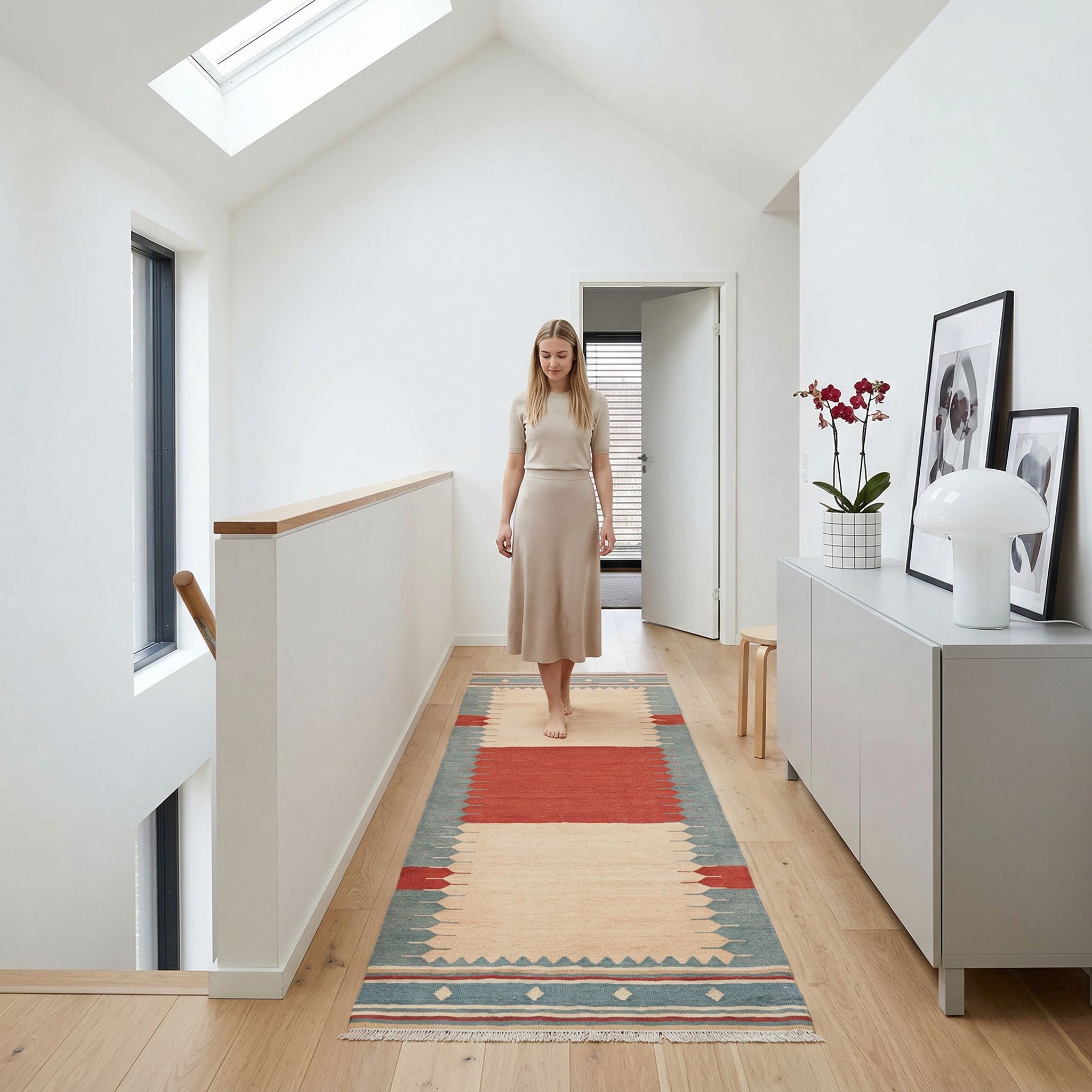 In einem skandinavischen Interieur fungiert dieser Teppich als gezielter Farb- und Wärmeakzent, der die oft kühle nordische Palette belebt. Die geometrische Klarheit des Musters respektiert die skandinavische Formensprache, während die Wolle das essentielle "Hygge"-Gefühl von Gemütlichkeit transportiert. Besonders die gedämpften Blau-Grau-Töne im Randbereich korrespondieren schön mit hellen Hölzern und weißen Wänden. Er bricht die Strenge des Minimalismus auf hochwertige Weise auf und verleiht dem Raum mehr Tiefe und Charakter.