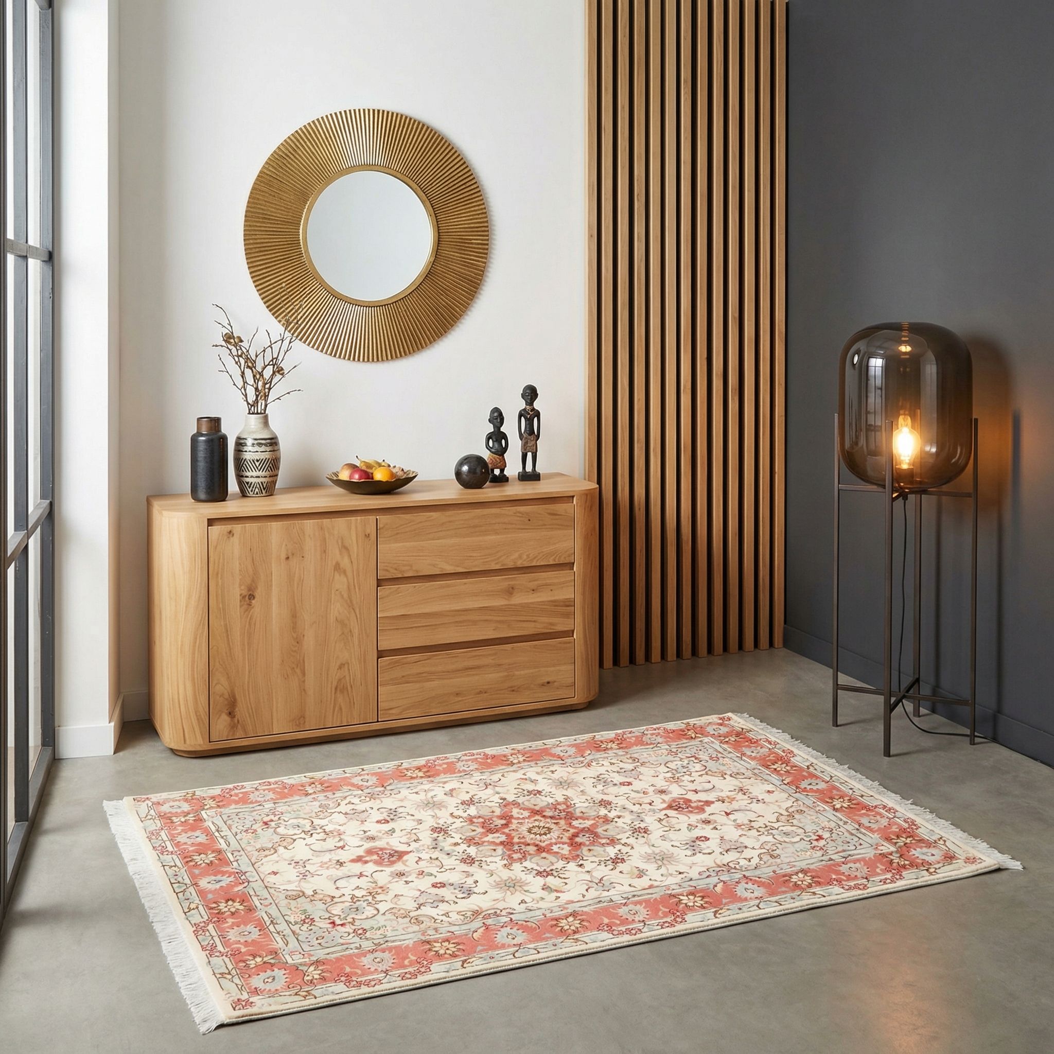 In einem Loft im Industrial-Style wirkt dieser edle Täbriz-Teppich als faszinierender Kontrapunkt zu rohem Beton, unverputzten Ziegelwänden und kühlem Metall. Die zarten floralen Motive und der seidige Glanz brechen die Härte des industriellen Looks bewusst auf und sorgen für eine überraschende und spannende Wohnlichkeit. Gerade dieser starke Gegensatz zwischen der rauen Fabrik-Ästhetik und der extrem feinen Knüpfung von ca. 530.000 Knoten pro Quadratmeter macht den besonderen Reiz der Einrichtung aus. Der Teppich definiert im offenen Raum eine Insel der Eleganz und macht das kühle Loft sofort weicher und individueller.