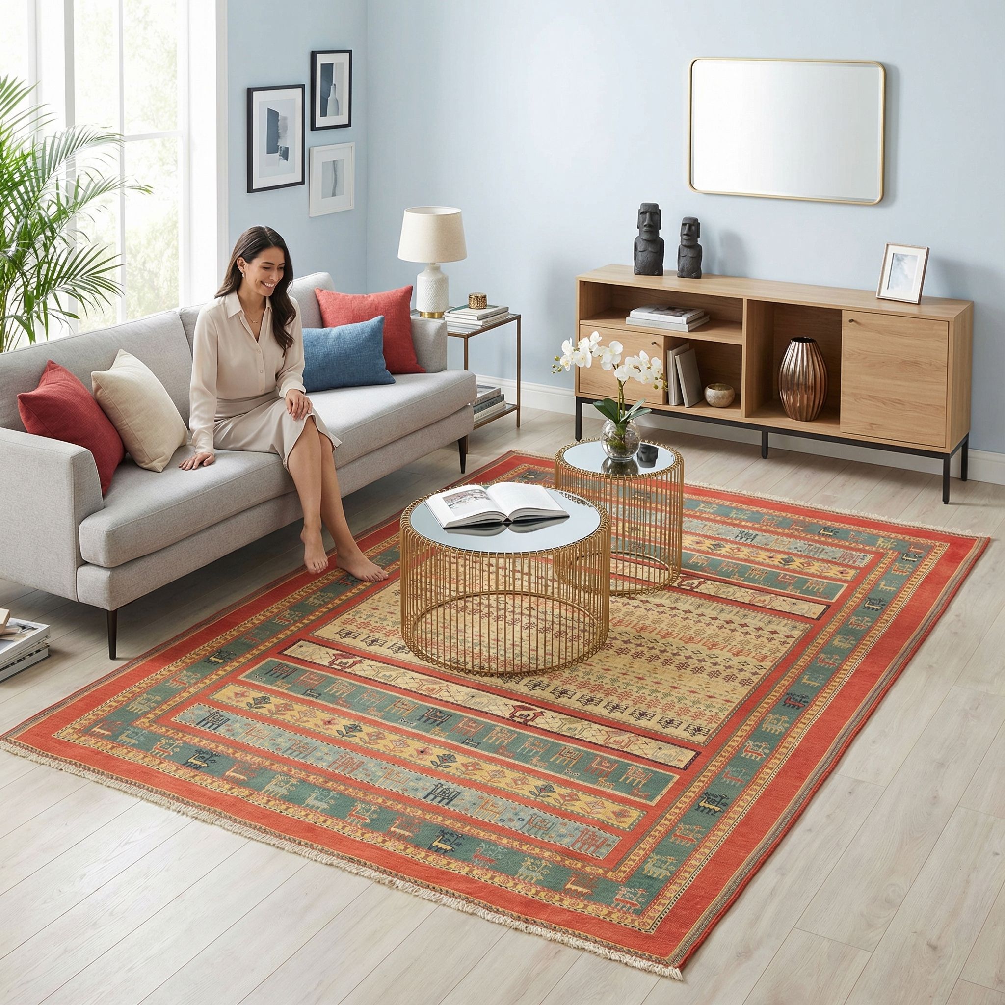 In der klaren und oft farblich reduzierten Welt des Skandi-Designs setzt dieser Sumack-Kelim einen warmen, lebendigen Farbakzent, der das Konzept von „Hygge“ perfektioniert. Die Verwendung reinster, handversponnener Schafwolle bringt jene natürliche Textur und Wärme in den Raum, die als Kontrast zu hellen Hölzern und schlichten Formen für nordische Gemütlichkeit unverzichtbar ist. Das geometrische Design bricht die sterile Optik auf stilvolle Weise, ohne die ruhige Grundstimmung des Raumes zu stören, und fungiert als Ankerpunkt im Zimmer. Da Nachhaltigkeit und Qualität im skandinavischen Stil großgeschrieben werden, überzeugt dieses langlebige Stück durch seine rein manuelle Herstellung und die hochwertigen Naturmaterialien.