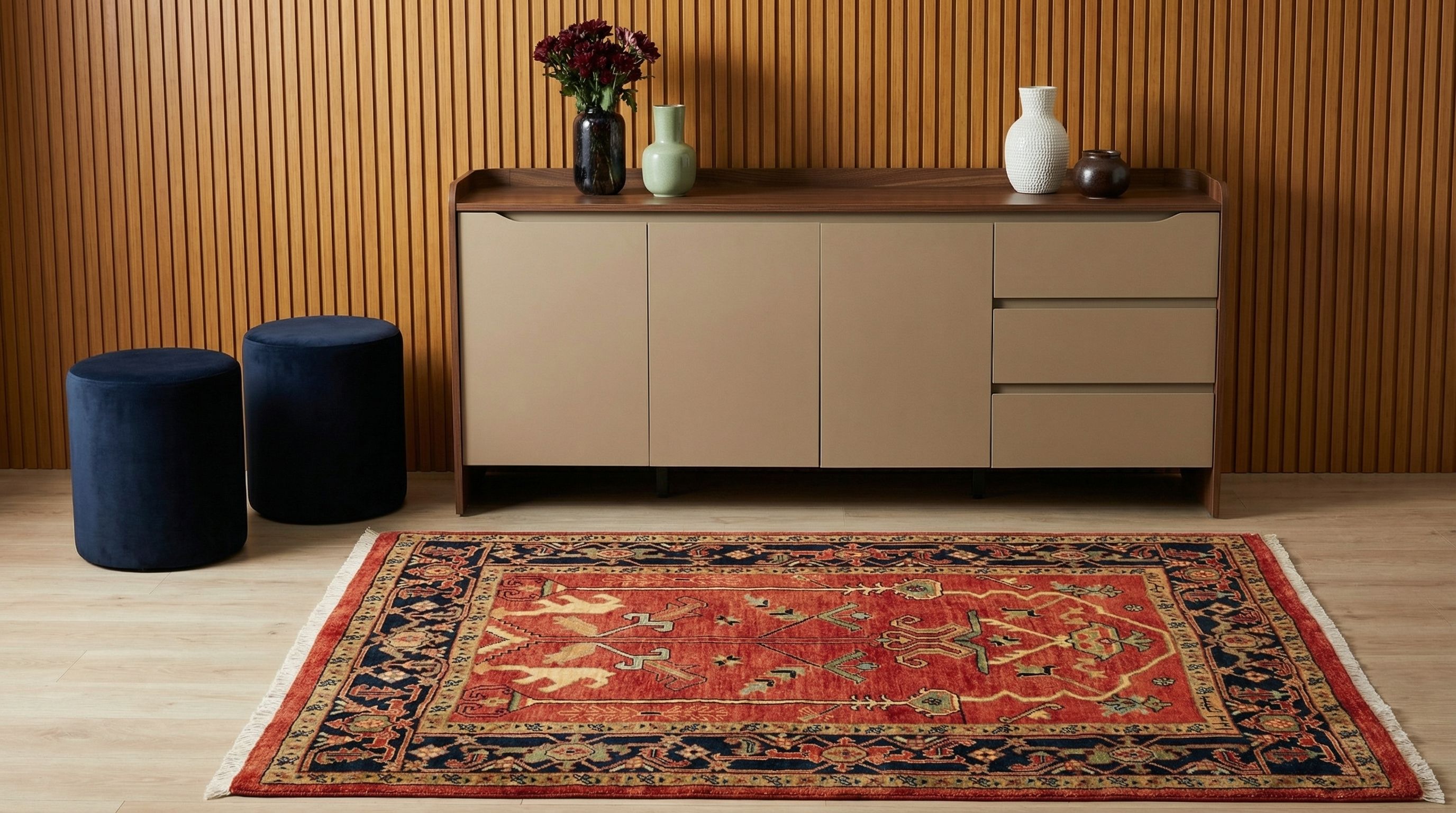 Hier präsentieren wir Ihnen einen handgeknüpften Ghadimi-Teppich aus dem renommierten Hause Mesgarzadeh, der durch seine meisterhafte Knüpfkunst und zeitlose Eleganz besticht. Die Hauptfarbe des Teppichs ist ein warmes Ziegelrot, das dem Raum eine einladende Atmosphäre verleiht. Ergänzt wird dieses durch ein tiefes Mitternachtsblau, das in den Bordüren und Details zu finden ist. Dezente Akzente in Creme setzen weitere harmonische Kontraste. Das Muster ist eine moderne Interpretation ...mehr Beschreibung