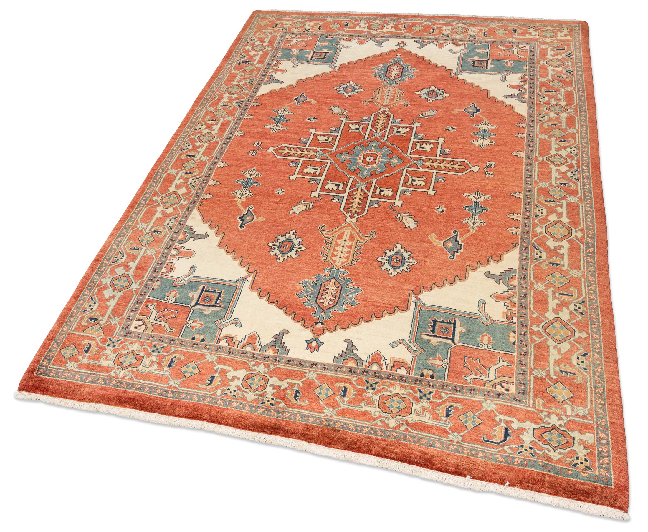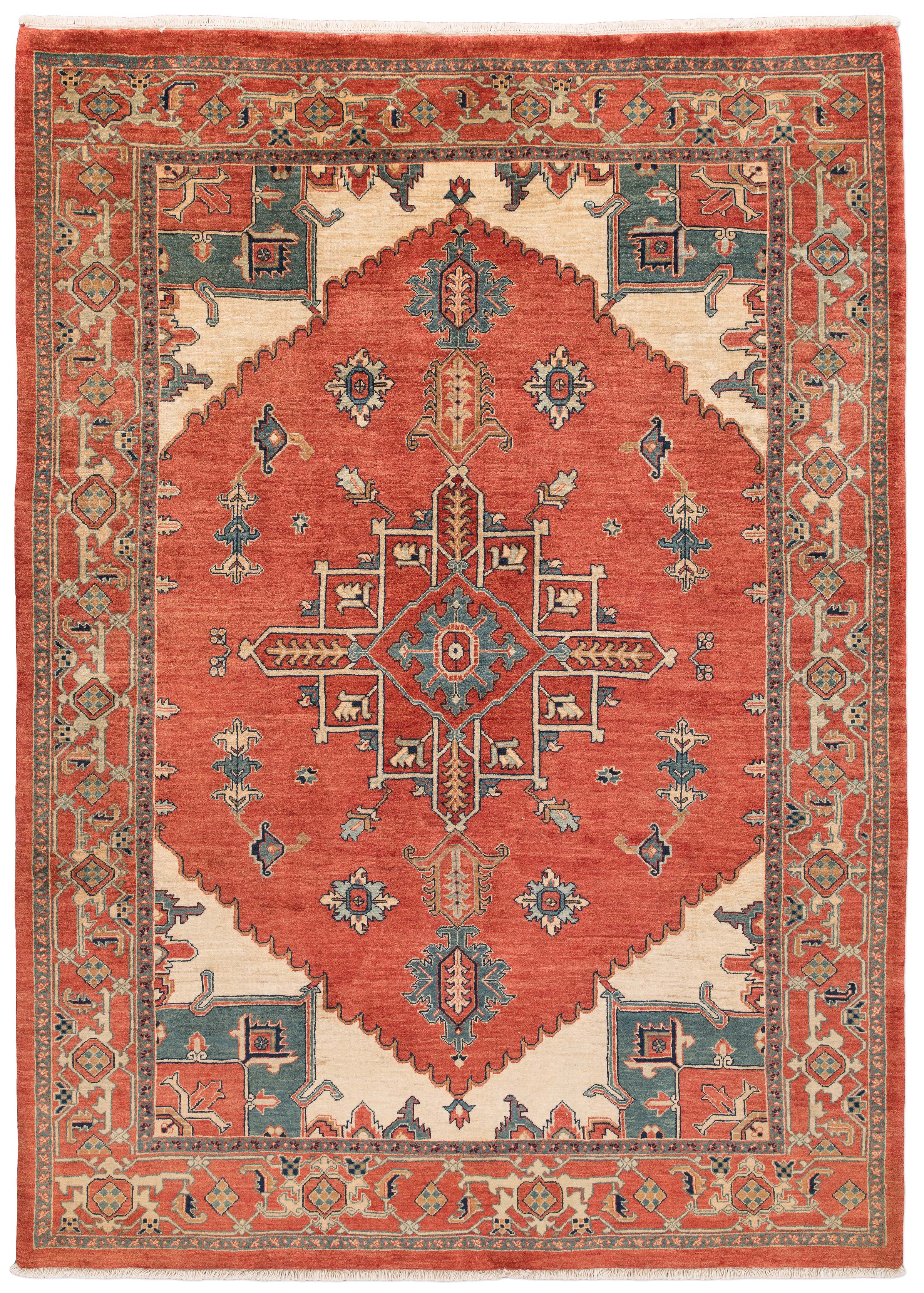 Dieser handgeknüpfte Ghadimi-Teppich aus dem Hause Mesgarzadeh beeindruckt durch seine leuchtende Hauptfarbe Terrakotta, die dem Stück eine warme und einladende Ausstrahlung verleiht. Ergänzt wird diese durch einen eleganten Beigeton sowie Akzente in einem satten Petrolblau, die zusammen ein harmonisches Gesamtbild ergeben. Die Musterung ist traditionell inspiriert und präsentiert sich mit einem zentralen Medaillon, umgeben von stilisierten floralen und geometrischen Elementen, die an ...mehr Beschreibung