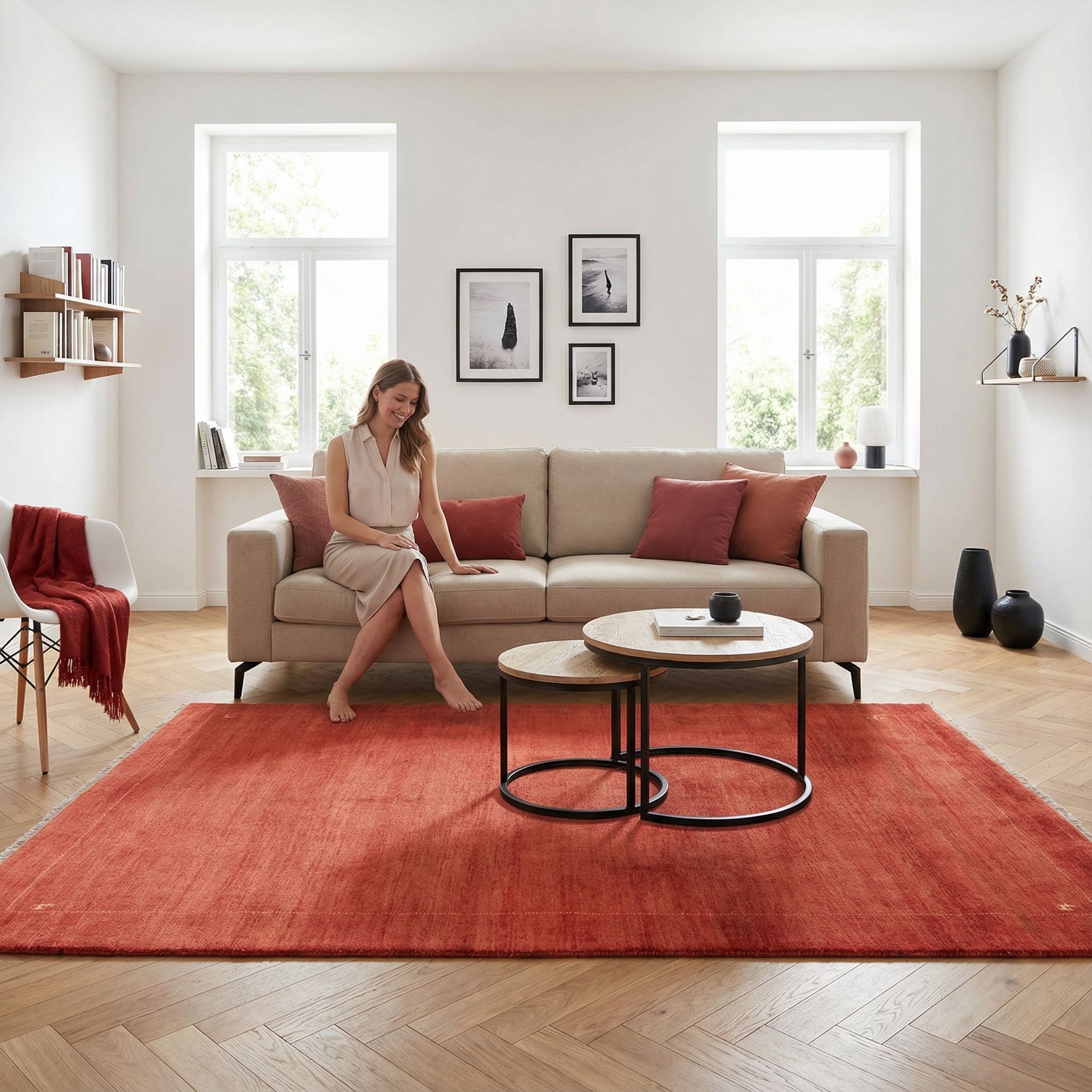 In der nordischen Einrichtung dient dieser Teppich als warmer "Pop of Color", der die sonst so neutrale Farbpalette aus Weiß, Grau und hellem Holz belebt und spannend kontrastiert. Die Skandinavier lieben reine Naturmaterialien, weshalb die hochwertige, handversponnene Schafwolle ohne künstliche Zusätze genau den Nerv dieses nachhaltigen Wohnstils trifft. Das minimalistische Design mit den nur dezenten Mustern in den Ecken stört die klare Linienführung nicht, sondern fügt lediglich eine Ebene von Textur und Komfort hinzu. So entsteht das berühmte "Hygge"-Gefühl, indem der Teppich den Raum optisch aufwärmt und zum Verweilen einlädt.