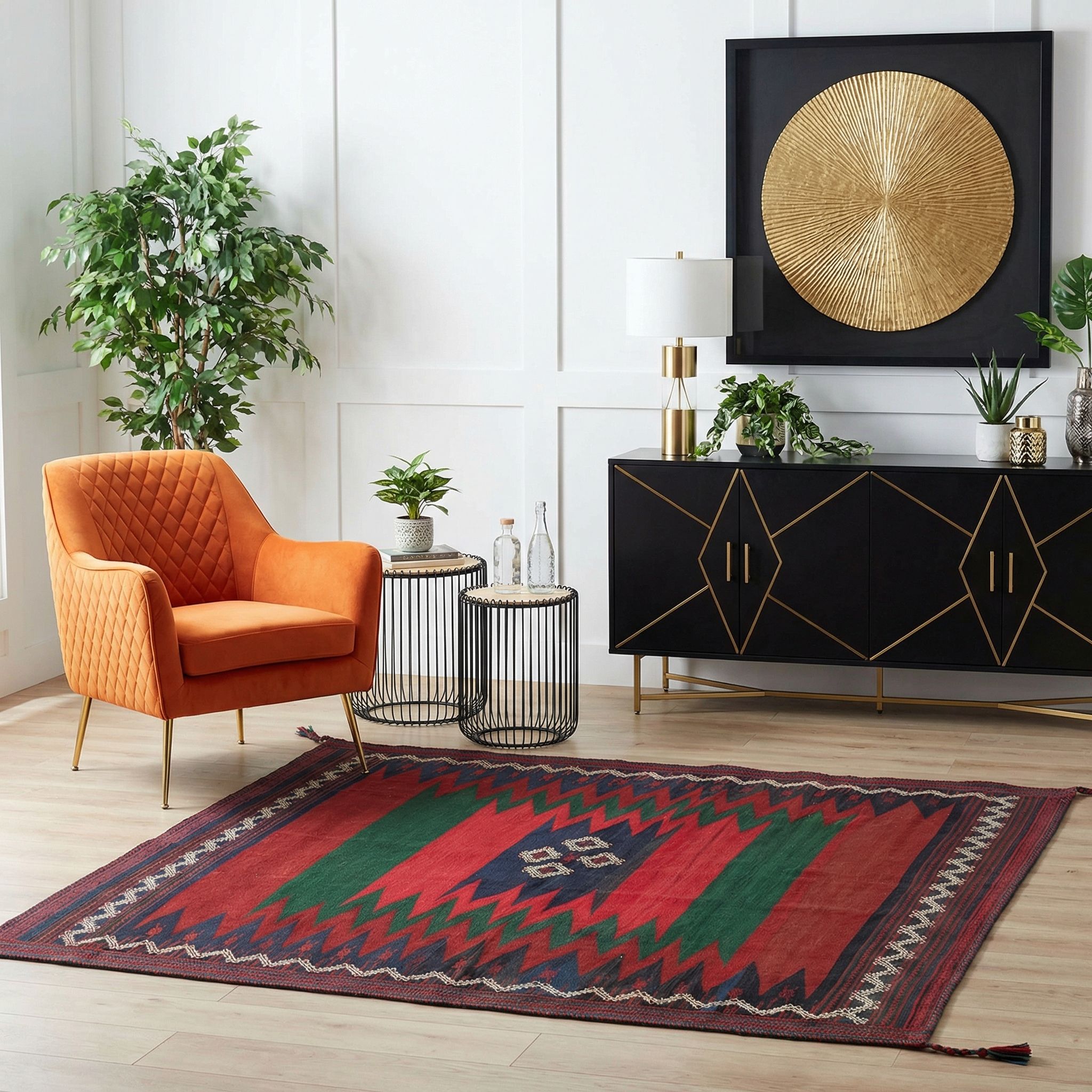 Als bewusster Stilbruch eingesetzt, wird dieser südiranische Kelim zum absoluten Highlight in einem ansonsten hellen und minimalistischen skandinavischen Interieur. Die klare, geometrische Linienführung des Musters spricht die nordische Vorliebe für Ordnung an, während die intensiven Pflanzenfarben die typische weiße und graue Farbpalette kraftvoll durchbrechen. Er bringt die im Norden so geschätzte „Hygge“-Gemütlichkeit auf eine exotische Art in den Raum, ohne überladen zu wirken. Auf einem hellen Holzboden platziert, entfaltet dieses feine Gewebe seine volle Strahlkraft und verwandelt den Raum von schlicht zu raffiniert kuratiert.